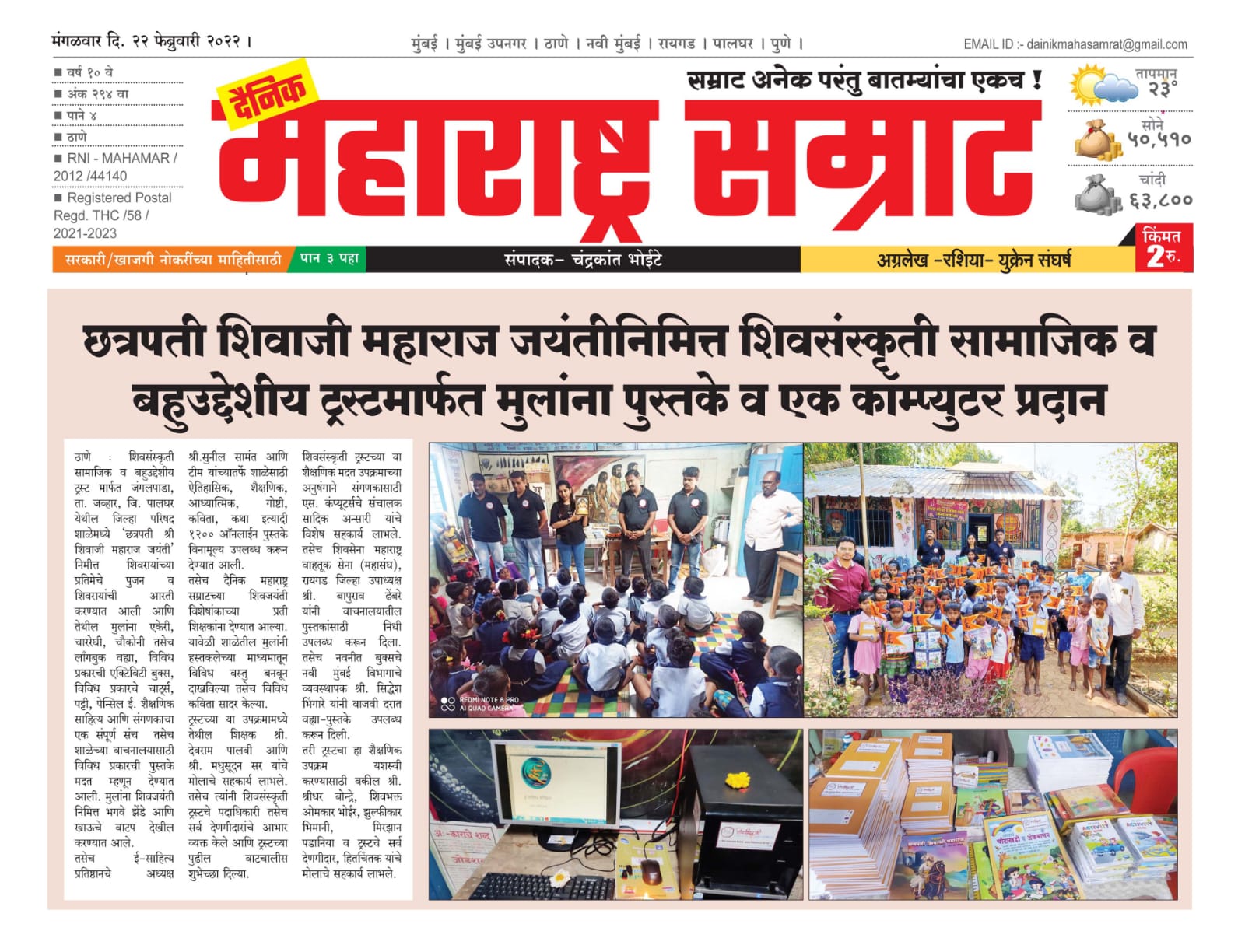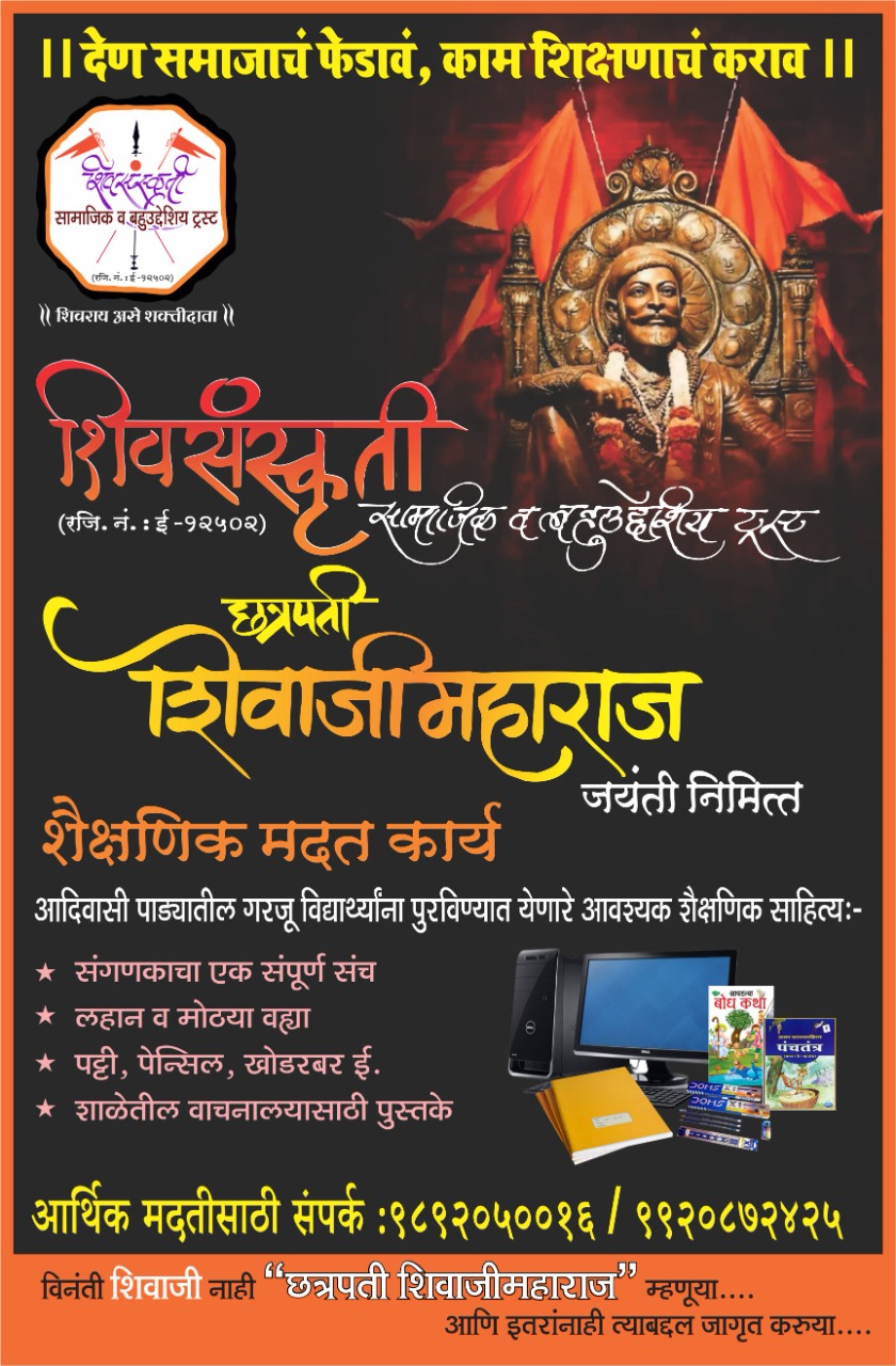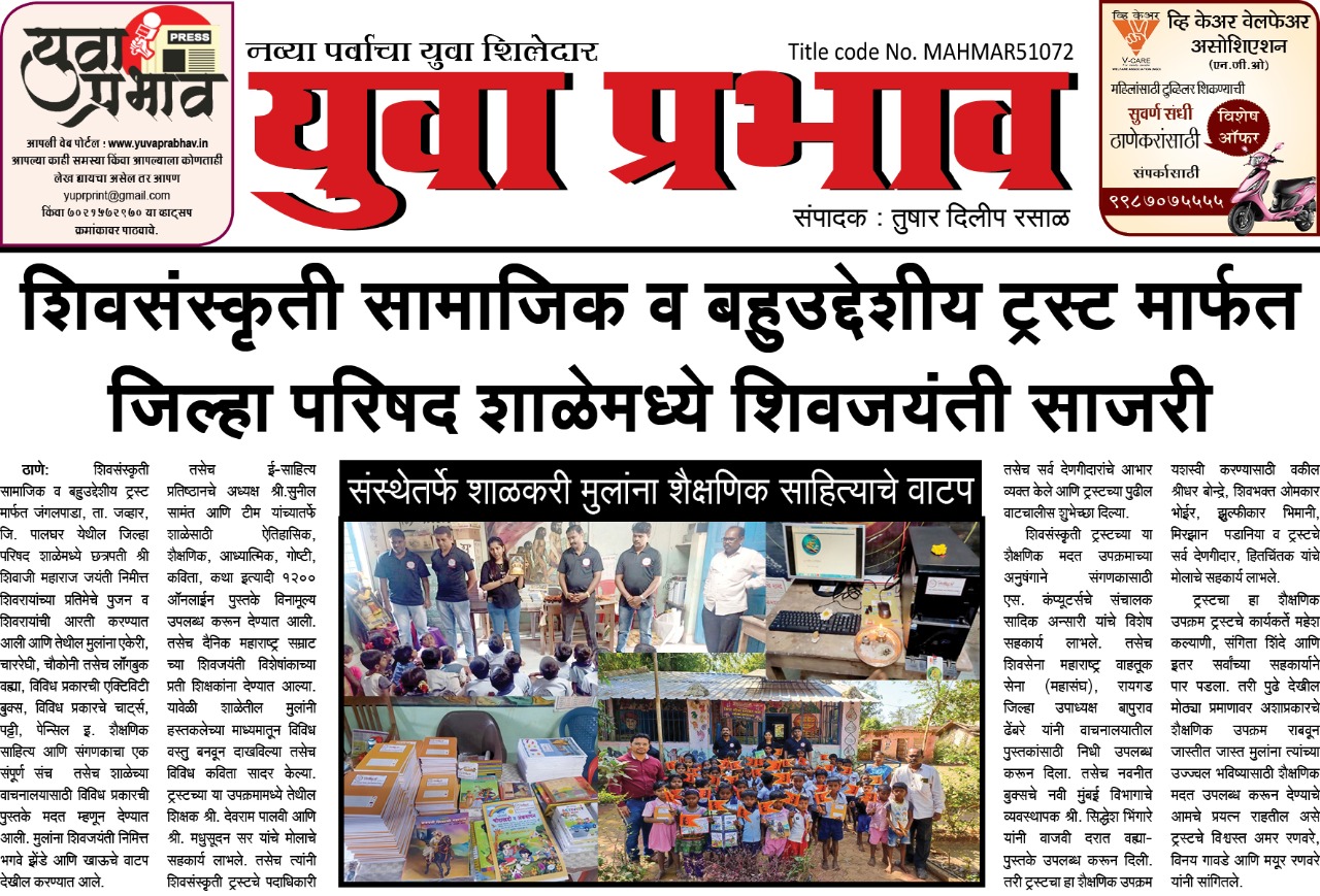 शिवसंस्कृती सामाजिक व बहुउद्देशीय ट्रस्ट मार्फत जंगलपाडा, ता. जव्हार, जि. पालघर येथील जिल्हा परिषद शाळेमध्ये छत्रपती श्री शिवाजीमहाराज जयंती निमीत्त शिवरायांच्या प्रतिमेचे पुजन व शिवरायांची आरती करण्यात आली आणि तेथील मुलांना एकेरी, चाररेघी, चौकोनी तसेच लॉंगबुक वह्या, विविध प्रकारची एक्टिविटी बुक्स, विविध प्रकारचे चार्ट्स, पट्टी, पेन्सिल ई. शैक्षणिक साहित्य आणि संगणकाचा एक संपूर्ण संच तसेच शाळेच्या वाचनालयासाठी विविध प्रकारची पुस्तके मदत म्हणून देण्यात आली. मुलांना शिवजयंती निमित्त भगवे झेंडे आणि खाऊचे वाटप देखील करण्यात आले. तसेच ई-साहित्य प्रतिष्ठानचे अध्यक्ष श्री.सुनील सामंत आणि टीम यांच्यातर्फे शाळेसाठी ऐतिहासिक, शैक्षणिक, आध्यात्मिक, गोष्टी, कविता, कथा इत्यादी १२०० ऑनलाईन पुस्तके विनामूल्य उपलब्ध करून देण्यात आली. तसेच दैनिक महाराष्ट्र सम्राट च्या शिवजयंती विशेषांकाच्या प्रती शिक्षकांना देण्यात आल्या. यावेळी शाळेतील मुलांनी हस्तकलेच्या माध्यमातून विविध वस्तु बनवून दाखविल्या तसेच विविध कविता सादर केल्या. ट्रस्टच्या या उपक्रमामध्ये तेथील शिक्षक श्री. देवराम पालवी आणि श्री. मधुसूदन सर यांचे मोलाचे सहकार्य लाभले. तसेच त्यांनी शिवसंस्कृती ट्रस्टचे पदाधिकारी तसेच सर्व देणगीदारांचे आभार व्यक्त केले आणि ट्रस्टच्या पुढील वाटचालीस शुभेच्छा दिल्या. || जय शिवराय ||