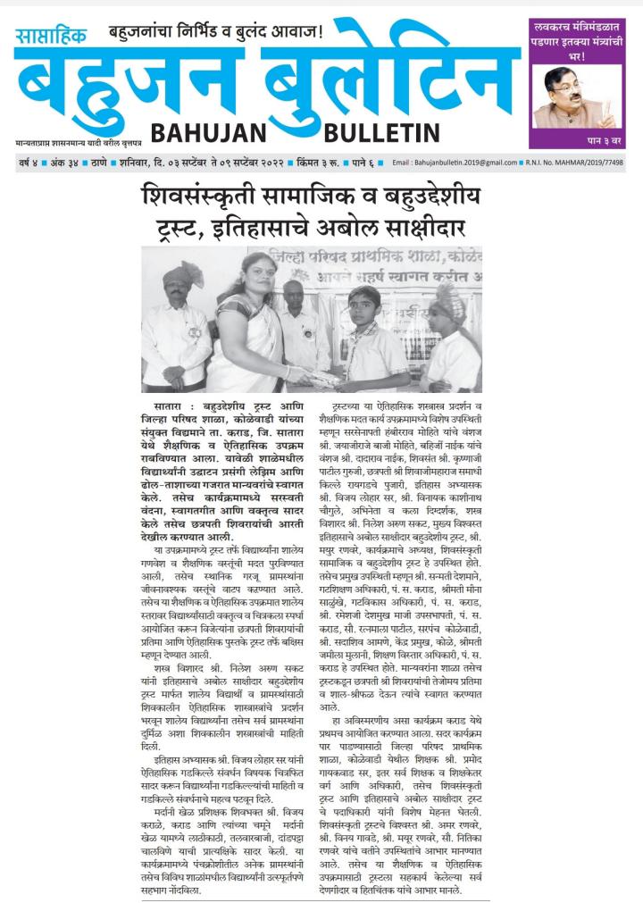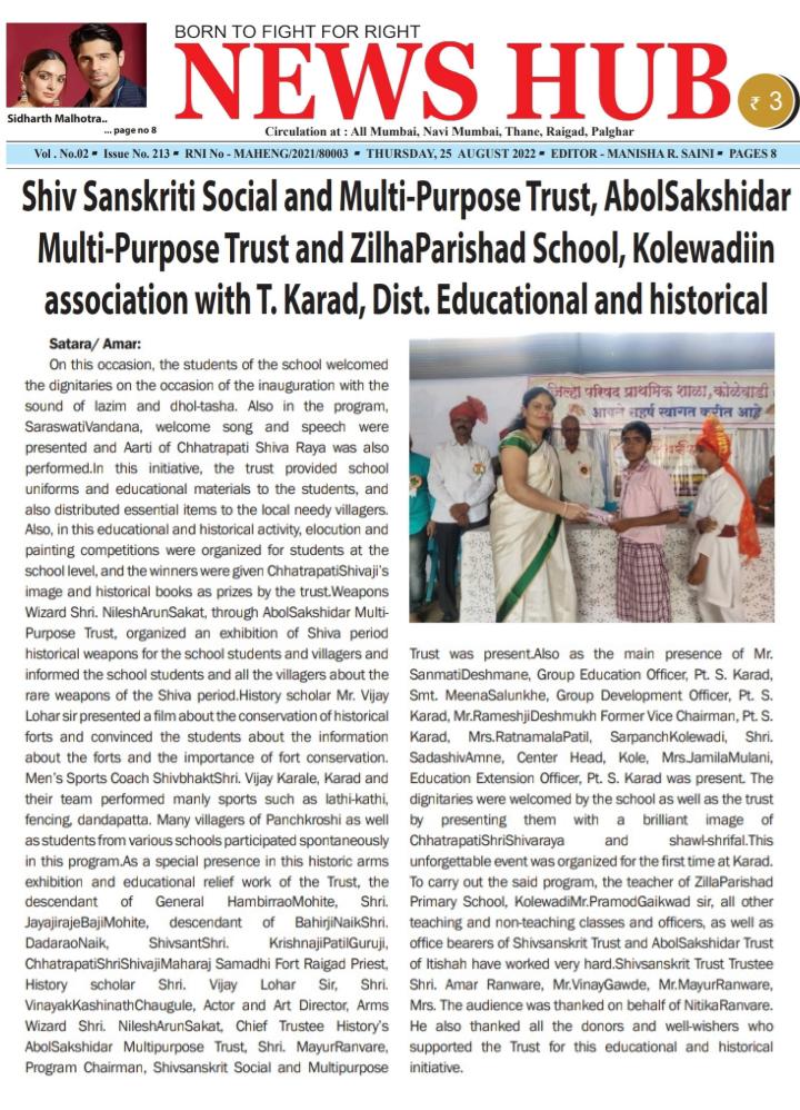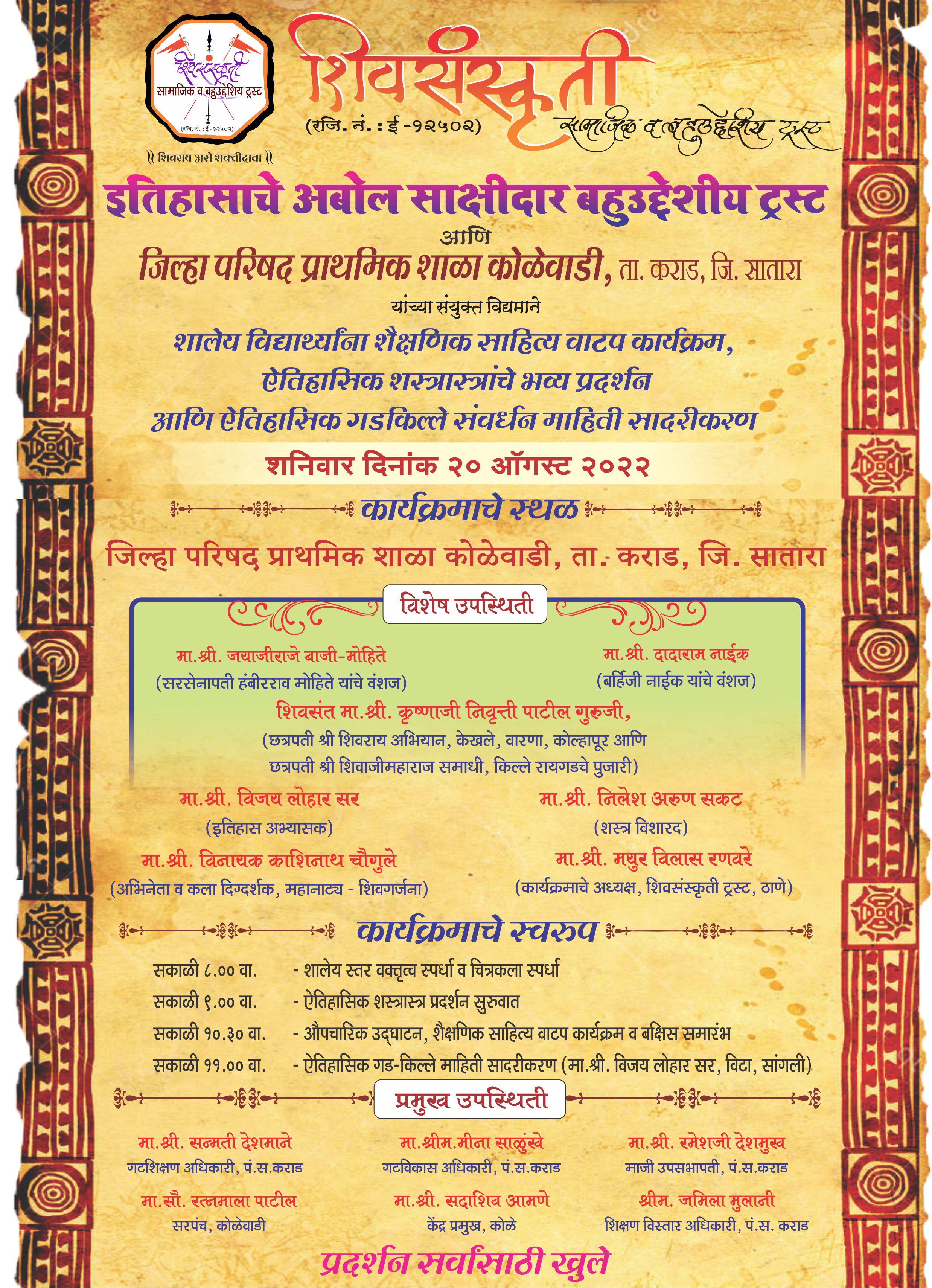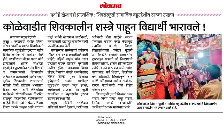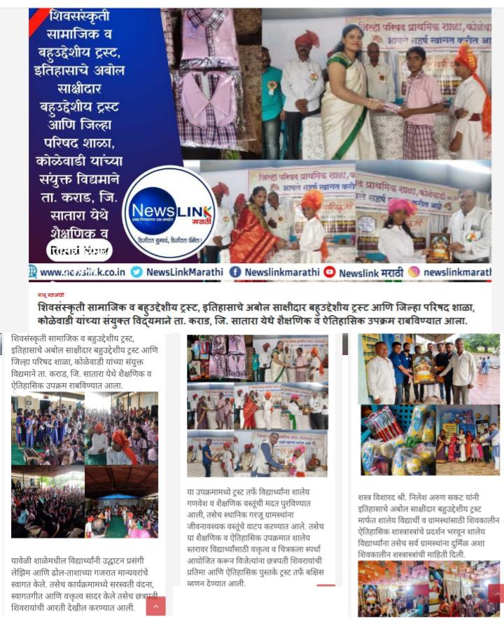 शिवसंस्कृती सामाजिक व बहुउद्देशीय ट्रस्ट, इतिहासाचे अबोल साक्षीदार बहुउद्देशीय ट्रस्ट आणि जिल्हा परिषद शाळा, कोळेवाडी यांच्या संयुक्त विद्यमाने ता. कराड, जि. सातारा येथे शैक्षणिक व ऐतिहासिक उपक्रम राबविण्यात आला. यावेळी शाळेमधील विद्यार्थ्यांनी उद्घाटन प्रसंगी लेझिम आणि ढोल-ताशाच्या गजरात मान्यवरांचे स्वागत केले. तसेच कार्यक्रमामध्ये सरस्वती वंदना, स्वागतगीत आणि वक्तृत्व सादर केले तसेच छत्रपती शिवरायांची आरती देखील करण्यात आली. या उपक्रमामध्ये ट्रस्ट तर्फे विद्यार्थ्यांना शालेय गणवेश व शैक्षणिक वस्तूंची मदत पुरविण्यात आली, तसेच स्थानिक गरजू ग्रामस्थांना जीवनावश्यक वस्तूंचे वाटप कऱण्यात आले. तसेच या शैक्षणिक व ऐतिहासिक उपक्रमात शालेय स्तरावर विद्यार्थ्यांसाठी वक्तृत्व व चित्रकला स्पर्धा आयोजित करून विजेत्यांना छत्रपती शिवरायांची प्रतिमा आणि ऐतिहासिक पुस्तके ट्रस्ट तर्फे बक्षिस म्हणून देण्यात आली. शस्त्र विशारद श्री. निलेश अरुण सकट यांनी इतिहासाचे अबोल साक्षीदार बहुउद्देशीय ट्रस्ट मार्फत शालेय विद्यार्थी व ग्रामस्थांसाठी शिवकालीन ऐतिहासिक शास्त्रास्त्रांचे प्रदर्शन भरवून शालेय विद्यार्थ्यांना तसेच सर्व ग्रामस्थांना दुर्मिळ अशा शिवकालीन शस्त्रास्त्रांची माहिती दिली. इतिहास अभ्यासक श्री. विजय लोहार सर यांनी ऐतिहासिक गडकिल्ले संवर्धन विषयक चित्रफित सादर करून विद्यार्थ्यांना गडकिल्ल्यांची माहिती व गडकिल्ले संवर्धनाचे महत्व पटवून दिले. मर्दानी खेळ प्रशिक्षक शिवभक्त श्री. विजय कराळे, कराड आणि त्यांच्या चमूने मर्दानी खेळ यामध्ये लाठीकाठी, तलवारबाजी, दांडपट्टा चालविणे याची प्रात्यक्षिके सादर केली. या कार्यक्रमामध्ये पंचक्रोशीतील अनेक ग्रामस्थांनी तसेच विविध शाळांमधील विद्यार्थ्यांनी उत्स्फूर्तपणे सहभाग नोंदविला. ट्रस्टच्या या ऐतिहासिक शस्त्रास्त्र प्रदर्शन व शैक्षणिक मदत कार्य उपक्रमामध्ये विशेष उपस्थिती म्हणून सरसेनापती हंबीरराव मोहिते यांचे वंशज श्री. जयाजीराजे बाजी मोहिते, बहिर्जी नाईक यांचे वंशज श्री. दादाराव नाईक, शिवसंत श्री. कृष्णाजी पाटील गुरुजी, छत्रपती श्री शिवाजीमहाराज समाधी किल्ले रायगडचे पुजारी, इतिहास अभ्यासक श्री. विजय लोहार सर, श्री. विनायक काशीनाथ चौगुले, अभिनेता व कला दिग्दर्शक, शस्त्र विशारद श्री. निलेश अरुण सकट, मुख्य विश्वस्त इतिहासाचे अबोल साक्षीदार बहुउद्देशीय ट्रस्ट, श्री. मयुर रणवरे, कार्यक्रमाचे अध्यक्ष, शिवसंस्कृती सामाजिक व बहुउद्देशीय ट्रस्ट हे उपस्थित होते. तसेच प्रमुख उपस्थिती म्हणून श्री. सन्मती देशमाने, गटशिक्षण अधिकारी, पं. स. कराड, श्रीमती मीना साळुंखे, गटविकास अधि