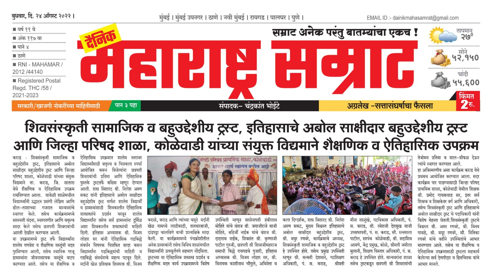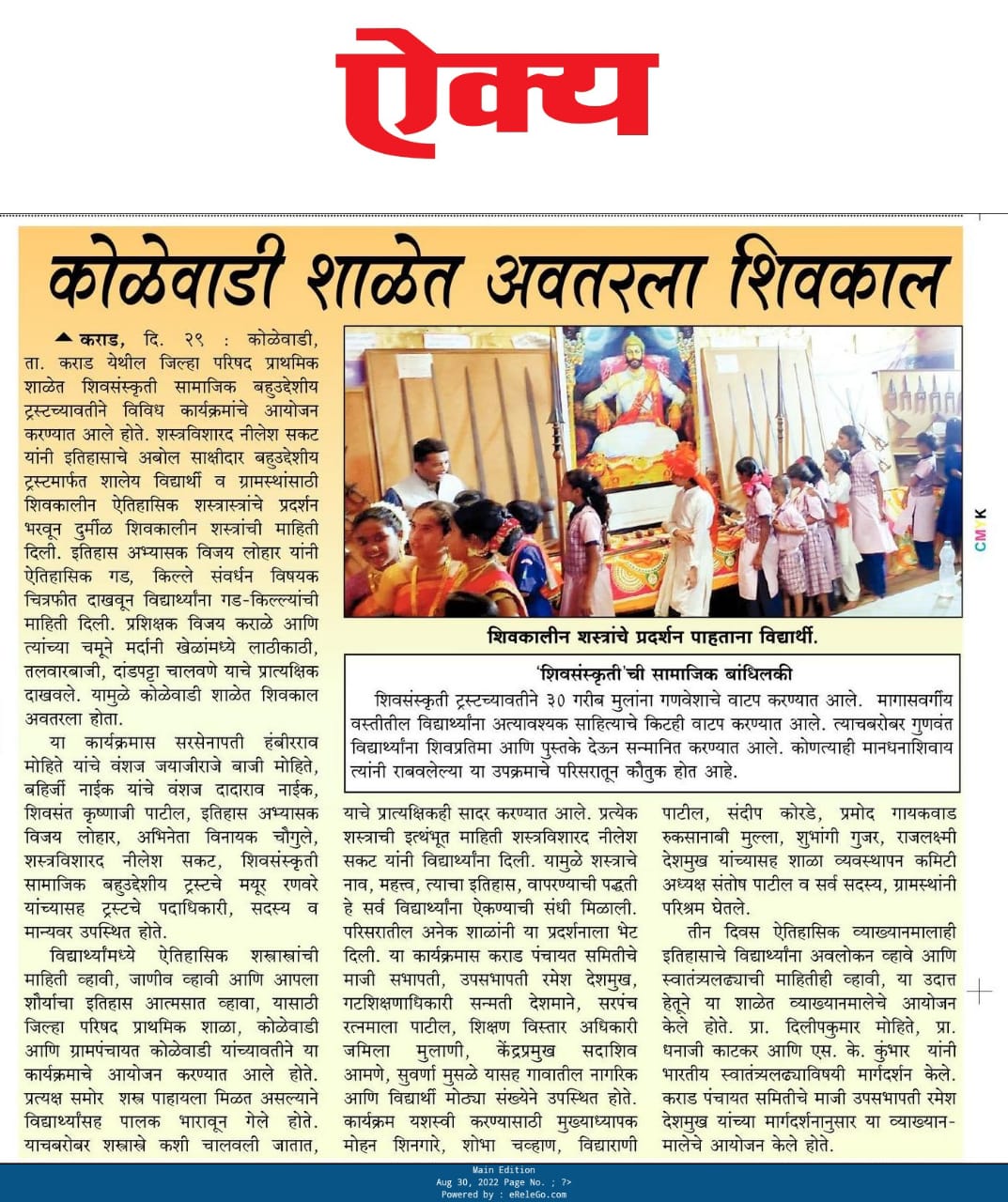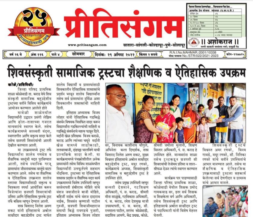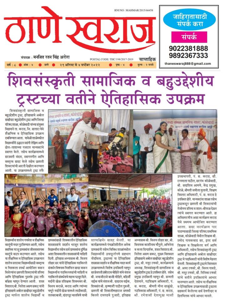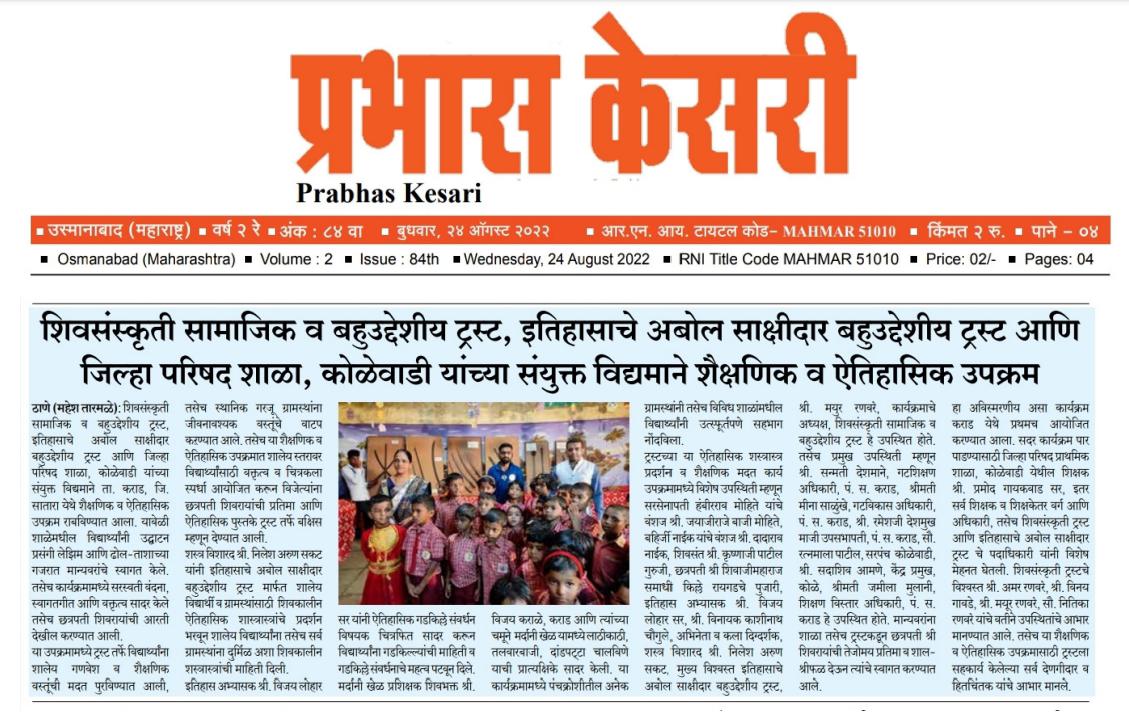 शिवसंस्कृती सामाजिक व बहुउद्देशीय ट्रस्ट, इतिहासाचे अबोल साक्षीदार बहुउद्देशीय ट्रस्ट आणि जिल्हा परिषद शाळा, कोळेवाडी यांच्या संयुक्त विद्यमाने ता. कराड, जि. सातारा येथे शैक्षणिक व ऐतिहासिक उपक्रम राबविण्यात आला. यावेळी शाळेमधील विद्यार्थ्यांनी उद्घाटन प्रसंगी लेझिम आणि ढोल-ताशाच्या गजरात मान्यवरांचे स्वागत केले. तसेच कार्यक्रमामध्ये सरस्वती वंदना, स्वागतगीत आणि वक्तृत्व सादर केले तसेच छत्रपती शिवरायांची आरती देखील करण्यात आली. या उपक्रमामध्ये ट्रस्ट तर्फे विद्यार्थ्यांना शालेय गणवेश व शैक्षणिक वस्तूंची मदत पुरविण्यात आली, तसेच स्थानिक गरजू ग्रामस्थांना जीवनावश्यक वस्तूंचे वाटप कऱण्यात आले. तसेच या शैक्षणिक व ऐतिहासिक उपक्रमात शालेय स्तरावर विद्यार्थ्यांसाठी वक्तृत्व व चित्रकला स्पर्धा आयोजित करून विजेत्यांना छत्रपती शिवरायांची प्रतिमा आणि ऐतिहासिक पुस्तके ट्रस्ट तर्फे बक्षिस म्हणून देण्यात आली. शस्त्र विशारद श्री. निलेश अरुण सकट यांनी इतिहासाचे अबोल साक्षीदार बहुउद्देशीय ट्रस्ट मार्फत शालेय विद्यार्थी व ग्रामस्थांसाठी शिवकालीन ऐतिहासिक शास्त्रास्त्रांचे प्रदर्शन भरवून शालेय विद्यार्थ्यांना तसेच सर्व ग्रामस्थांना दुर्मिळ अशा शिवकालीन शस्त्रास्त्रांची माहिती दिली. इतिहास अभ्यासक श्री. विजय लोहार सर यांनी ऐतिहासिक गडकिल्ले संवर्धन विषयक चित्रफित सादर करून विद्यार्थ्यांना गडकिल्ल्यांची माहिती व गडकिल्ले संवर्धनाचे महत्व पटवून दिले. मर्दानी खेळ प्रशिक्षक शिवभक्त श्री. विजय कराळे, कराड आणि त्यांच्या चमूने मर्दानी खेळ यामध्ये लाठीकाठी, तलवारबाजी, दांडपट्टा चालविणे याची प्रात्यक्षिके सादर केली. या कार्यक्रमामध्ये पंचक्रोशीतील अनेक ग्रामस्थांनी तसेच विविध शाळांमधील विद्यार्थ्यांनी उत्स्फूर्तपणे सहभाग नोंदविला. ट्रस्टच्या या ऐतिहासिक शस्त्रास्त्र प्रदर्शन व शैक्षणिक मदत कार्य उपक्रमामध्ये विशेष उपस्थिती म्हणून सरसेनापती हंबीरराव मोहिते यांचे वंशज श्री. जयाजीराजे बाजी मोहिते, बहिर्जी नाईक यांचे वंशज श्री. दादाराव नाईक, शिवसंत श्री. कृष्णाजी पाटील गुरुजी, छत्रपती श्री शिवाजीमहाराज समाधी किल्ले रायगडचे पुजारी, इतिहास अभ्यासक श्री. विजय लोहार सर, श्री. विनायक काशीनाथ चौगुले, अभिनेता व कला दिग्दर्शक, शस्त्र विशारद श्री. निलेश अरुण सकट, मुख्य विश्वस्त इतिहासाचे अबोल साक्षीदार बहुउद्देशीय ट्रस्ट, श्री. मयुर रणवरे, कार्यक्रमाचे अध्यक्ष, शिवसंस्कृती सामाजिक व बहुउद्देशीय ट्रस्ट हे उपस्थित होते. तसेच प्रमुख उपस्थिती म्हणून श्री. सन्मती देशमाने, गटशिक्षण अधिकारी, पं. स. कराड, श्रीमती मीना साळुंखे, गटविकास अधि