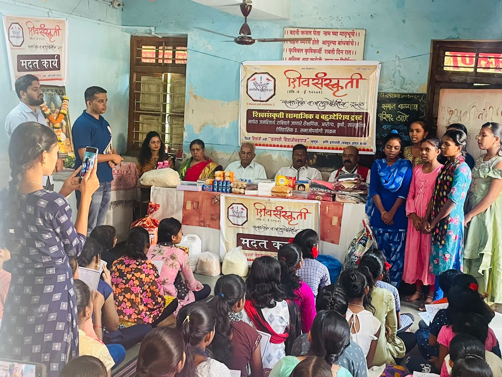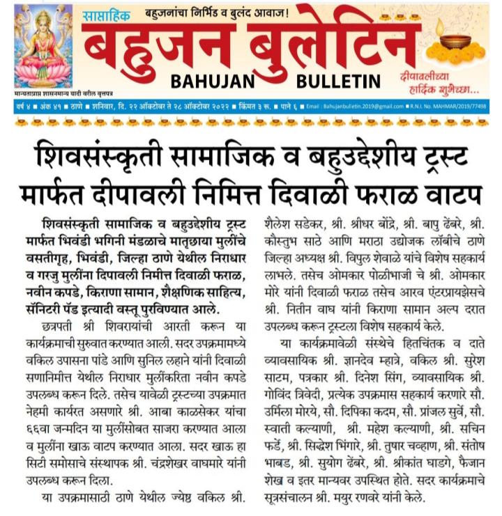 शिवसंस्कृती सामाजिक व बहुउद्देशीय ट्रस्ट मार्फत भिवंडी भगिनी मंडळाचे मातृछाया मुलींचे वसतीगृह, भिवंडी, जिल्हा ठाणे येथील निराधार व गरजु मुलींना दिपावली निमीत्त दिवाळी फराळ, नवीन कपडे, किराणा सामान, शैक्षणिक साहित्य, सॅनिटरी पॅड इत्यादी वस्तू पुरविण्यात आले. छत्रपती श्री शिवरायांची आरती करून या कार्यक्रमाची सुरुवात करण्यात आली. सदर उपक्रमामध्ये वकिल उपासना पांडे आणि सुनिल लहाने यांनी दिवाळी सणानिमीत्त येथील निराधार मुलींकरिता नवीन कपडे उपलब्ध करून दिले. तसेच यावेळी ट्रस्टच्या उपक्रमात नेहमी कार्यरत असणारे श्री. आबा काळसेकर यांचा ६६वा जन्मदिन या मुलींसोबत साजरा करण्यात आला व मुलींना खाऊ वाटप करण्यात आला. या कार्यक्रमासाठी भगिनी मंडळाच्या श्रीमती जयश्री शेलार तसेच सर्व मुलींनी विशेष मेहनत घेऊन हा कार्यक्रम पार पाडण्यास मोलाचे सहकार्य केले. यावेळी मुलींनी स्वागत गीत सादर करून उपस्थित मान्यवरांचे आभार व्यक्त केले. तसेच या मुली सर्व कठीण परिस्थितीला तोंड देऊन भगिनी मंडळाच्या सर्व पदाधिकाऱ्याच्या मार्गदर्शनाखाली कसे यश प्राप्त करीत आहेत याबाबत माहिती दिली आणि सोबतच ट्रस्टचे सर्व पदाधिकारी आणि उपस्थित असलेल्या तसेच ज्यांना येणे शक्य नाही तरी भरभरुन मदत दिलेल्या सर्व देणगीदार व हितचिंतक यांचे आभार मानले. शिवसंस्कृती ट्रस्ट मार्फत राबविण्यात येणाऱ्या सामाजिक उपक्रमास आपण करीत असलेल्या सहकार्याबद्दल आपले खुप खुप आभार......!! || जय शिवराय ||