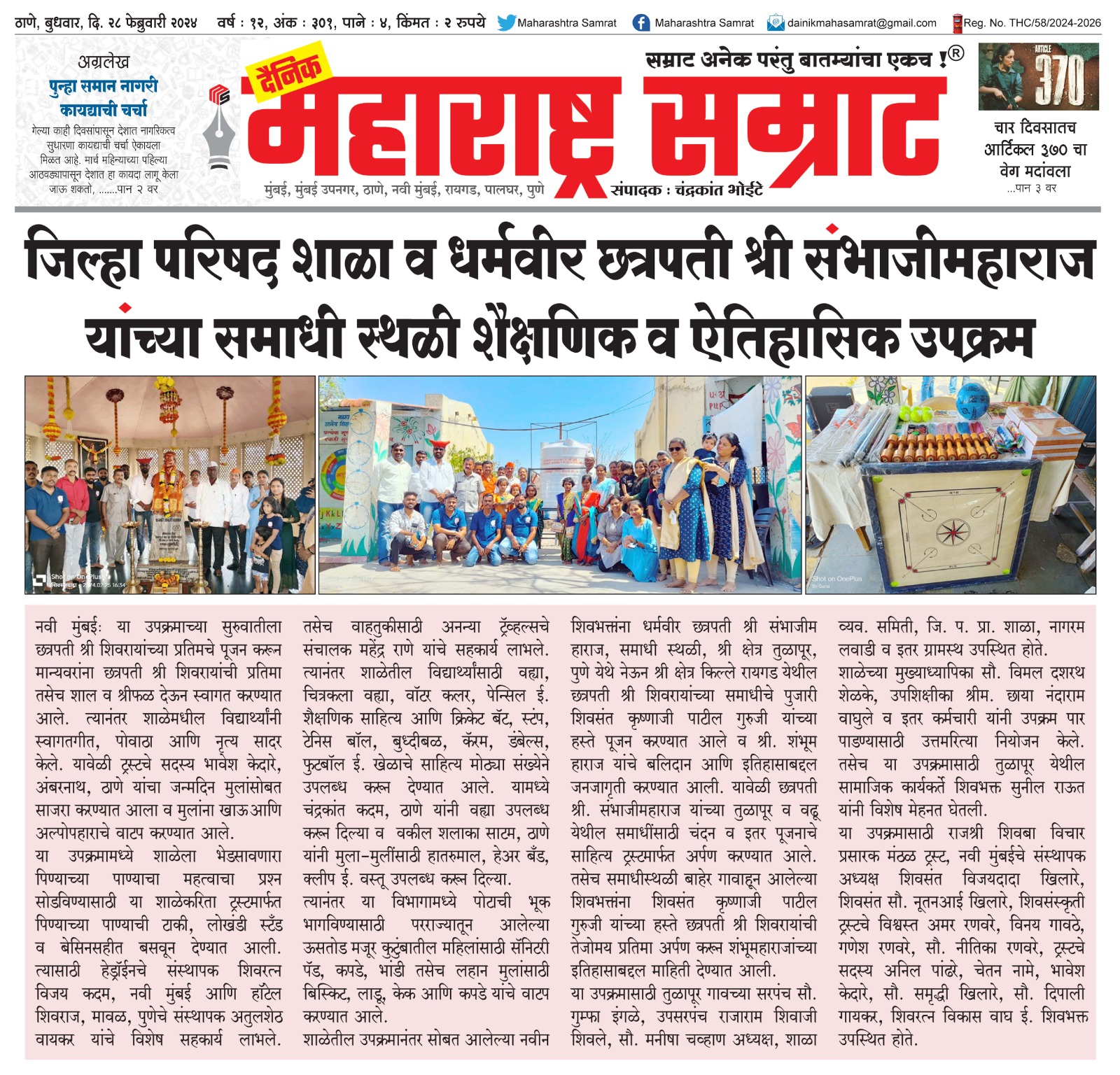 शिवसंस्कृती सामाजिक व बहुउद्देशीय ट्रस्ट, ठाणे आणि राजश्री शिवबा विचार प्रसारक मंडळ ट्रस्ट, नवी मुंबई यांच्या संयुक्त विद्यमाने तुळापूर, जि. पुणे येथील जिल्हा परिषद शाळा व धर्मवीर छत्रपती श्री संभाजीमहाराज यांच्या समाधी स्थळी तुळापूर येथे शैक्षणिक व ऐतिहासिक उपक्रम राबविण्यात आला. या उपक्रमाच्या सुरुवातीला छत्रपती श्री शिवरायांच्या प्रतिमचे पुजन करून मान्यवरांना छत्रपती श्री शिवरायांची प्रतिमा तसेच शाल व श्रीफळ देऊन स्वागत करण्यात आले. त्यानंतर शाळेमधील विद्यार्थ्यांनी स्वागतगीत, पोवाडा आणि नृत्य सादर केले. यावेळी ट्रस्टचे सदस्य श्री. भावेश केदारे, अंबरनाथ, ठाणे यांचा जन्मदिन मुलांसोबत साजरा करण्यात आला व मुलांना खाऊ आणि अल्पोपहाराचे वाटप करण्यात आले. या उपक्रमामध्ये शाळेला भेडसावणारा पिण्याच्या पाण्याचा महत्वाचा प्रश्न सोडविण्यासाठी या शाळेकरिता ट्रस्ट मार्फत पिण्याच्या पाण्याची टाकी, लोखंडी स्टँड व बेसिन सहीत बसवून देण्यात आली. त्यासाठी हेड्रॉईनचे संस्थापक शिवरत्न श्री. विजय कदम, नवी मुंबई आणि हॉटेल शिवराज, मावळ, पुणेचे संस्थापक श्री. अतुलशेठ वायकर यांचे विशेष सहकार्य लाभले. तसेच वाहतुकीसाठी अनन्या ट्रॅव्हल्सचे संचालक श्री. महेंद्र राणे यांचे सहकार्य लाभले. त्यानंतर शाळेतील विद्यार्थ्यांसाठी वह्या, चित्रकला वह्या, वॉटर कलर, पेन्सिल ई. शैक्षणिक साहित्य आणि क्रिकेट बॅट, स्टंप, टेनिस बॉल, बुध्दीबळ, कॅरम, डंबेल्स, फुटबॉल ई. खेळाचे साहित्य मोठ्या संख्येने उपलब्ध करून देण्यात आले. यामध्ये श्री. चंद्रकांत कदम, ठाणे यांनी वह्या उपलब्ध करून दिल्या व वकील शलाका साटम, ठाणे यांनी मुला-मुलींसाठी हातरुमाल, हेअर बँड, क्लीप ई. वस्तू उपलब्ध करून दिल्या. त्यानंतर या विभागामध्ये पोटाची भूक भागविण्यासाठी परराज्यातून आलेल्या ऊसतोड मजूर कुटुंबातील महिलांसाठी सॅनिटरी पॅड, कपडे, भांडी तसेच लहान मुलांसाठी बिस्किट, लाडू, केक आणि कपडे यांचे वाटप करण्यात आले. शाळेतील उपक्रमानंतर सोबत आलेल्या नविन शिवभक्तांना धर्मवीर छत्रपती श्री संभाजीमहाराज, समाधी स्थळी, श्री क्षेत्र तुळापूर, पुणे येथे नेऊन श्री क्षेत्र किल्ले रायगड येथील छत्रपती श्री शिवरायांच्या समाधीचे पुजारी शिवसंत श्री. कृष्णाजी पाटील गुरुजी यांच्या हस्ते पूजन करण्यात आले व श्री. शंभूमहाराज यांचे बलिदान आणि इतिहासाबद्दल जनजागृती करण्यात आली. यावेळी छत्रपती श्री. संभाजीमहाराज यांच्या तुळापूर व वढू येथील समाधींसाठी चंदन व इतर पूजनाचे साहित्य ट्रस्टमार्फत अर्पण करण्यात आले. तसेच समाधीस्थळी बाहेर गावाहून आलेल्या शिवभक्तांना शिवसंत श्री. कृष्णाजी पाटील गुरुजी यांच्या हस्ते छत्रपती श्