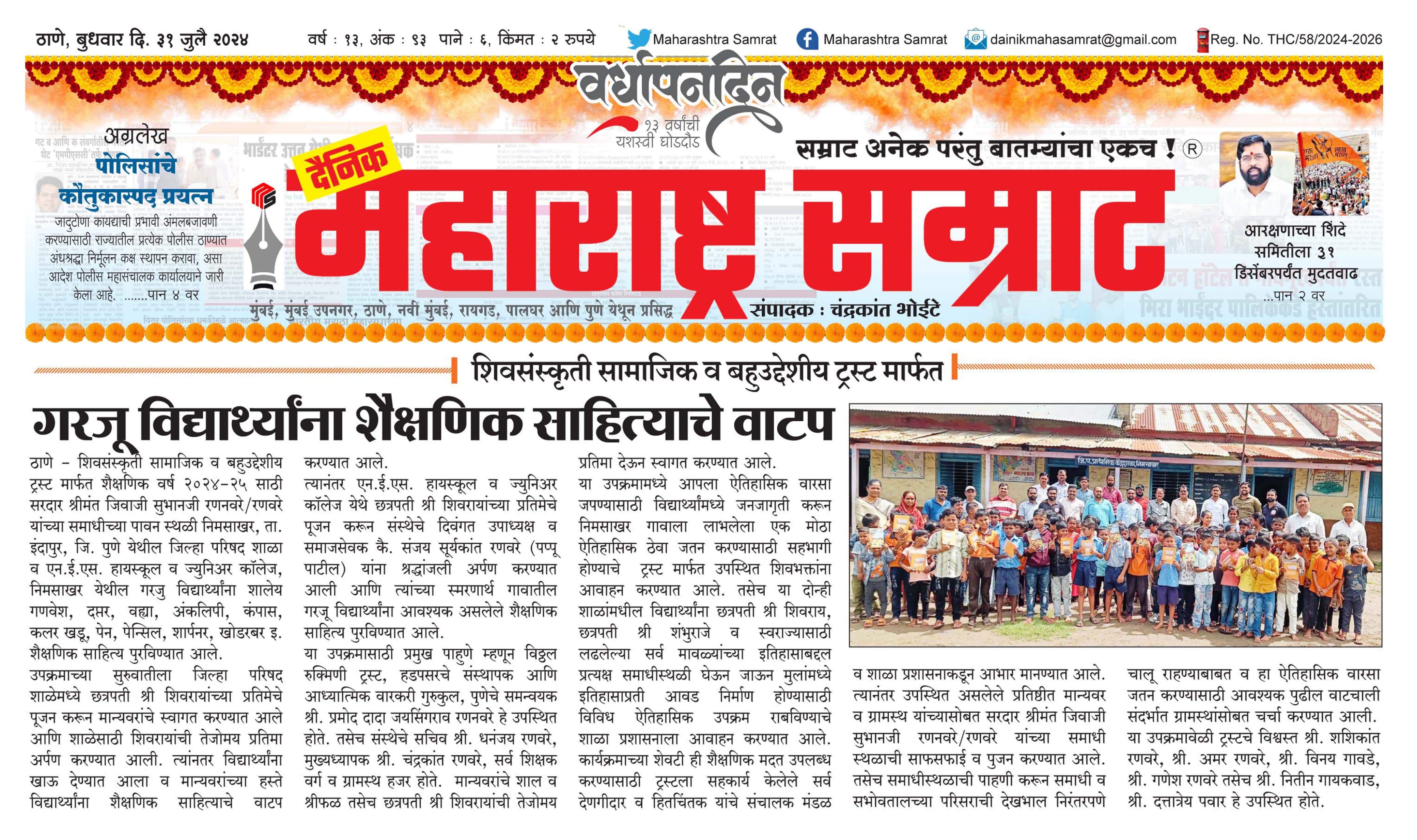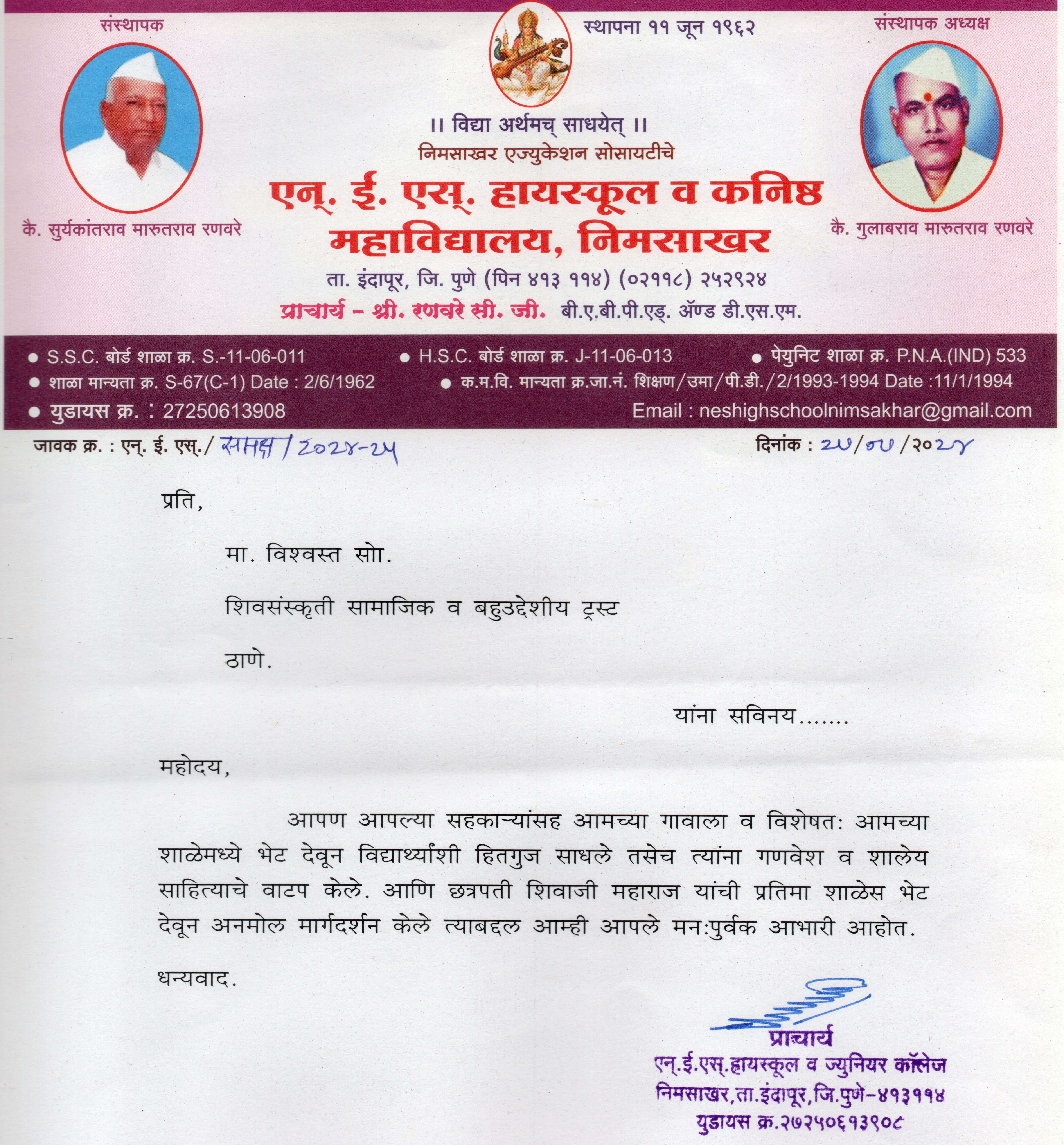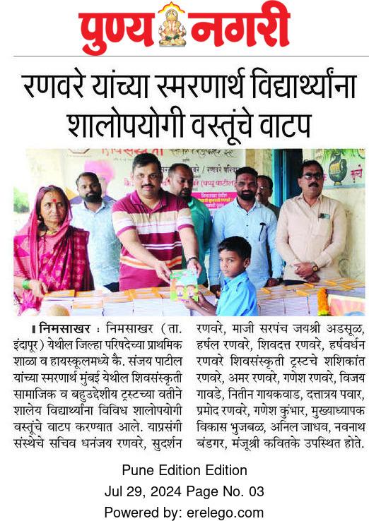 शिवसंस्कृती सामाजिक व बहुउद्देशीय ट्रस्ट मार्फत शैक्षणिक वर्ष २०२४-२५ साठी सरदार श्रीमंत जिवाजी सुभानजी रणनवरे/रणवरे यांच्या समाधीच्या पावन स्थळी निमसाखर, ता. इंदापुर, जि. पुणे येथील जिल्हा परिषद शाळा व एन.ई.एस. हायस्कूल व ज्युनिअर कॉलेज, निमसाखर येथील गरजु विद्यार्थ्यांना शालेय गणवेश, दप्तर, वह्या, अंकलिपी, कंपास, कलर खडू, पेन, पेन्सिल, शार्पनर, खोडरबर इ. शैक्षणिक साहित्य पुरविण्यात आले. उपक्रमाच्या सुरुवातीला जिल्हा परिषद शाळेमध्ये छत्रपती श्री शिवरायांच्या प्रतिमेचे पूजन करून मान्यवरांचे स्वागत करण्यात आले आणि शाळेसाठी शिवरायांची तेजोमय प्रतिमा अर्पण करण्यात आली. त्यांनतर विद्यार्थ्यांना खाऊ देण्यात आला व मान्यवरांच्या हस्ते विद्यार्थ्यांना शैक्षणिक साहित्याचे वाटप करण्यात आले. त्यानंतर एन.ई.एस. हायस्कूल व ज्युनिअर कॉलेज येथे छत्रपती श्री शिवरायांच्या प्रतिमेचे पूजन करून संस्थेचे दिवंगत उपाध्यक्ष व समाजसेवक कै. संजय सूर्यकांत रणवरे (पप्पू पाटील) यांना श्रद्धांजली अर्पण करण्यात आली आणि त्यांच्या स्मरणार्थ गावातील गरजू विद्यार्थ्यांना आवश्यक असलेले शैक्षणिक साहित्य पुरविण्यात आले. या उपक्रमासाठी प्रमुख पाहुणे म्हणून विठ्ठल रुक्मिणी ट्रस्ट, हडपसरचे संस्थापक आणि आध्यात्मिक वारकरी गुरुकुल, पुणेचे समन्वयक श्री. प्रमोद दादा जयसिंगराव रणनवरे हे उपस्थित होते. तसेच संस्थेचे सचिव श्री. धनंजय रणवरे, मुख्यध्यापक श्री. चंद्रकांत रणवरे, सर्व शिक्षक वर्ग व ग्रामस्थ हजर होते. मान्यवरांचे शाल व श्रीफळ तसेच छत्रपती श्री शिवरायांची तेजोमय प्रतिमा देऊन स्वागत करण्यात आले. या उपक्रमामध्ये आपला ऐतिहासिक वारसा जपण्यासाठी विद्यार्थ्यांमध्ये जनजागृती करून निमसाखर गावाला लाभलेला एक मोठा ऐतिहासिक ठेवा जतन करण्यासाठी सहभागी होण्याचे ट्रस्ट मार्फत उपस्थित शिवभक्तांना आवाहन करण्यात आले. तसेच या दोन्ही शाळांमधील विद्यार्थ्यांना छत्रपती श्री शिवराय, छत्रपती श्री शंभुराजे व स्वराज्यासाठी लढलेल्या सर्व मावळ्यांच्या इतिहासाबद्दल प्रत्यक्ष समाधीस्थळी घेऊन जाऊन मुलांमध्ये इतिहासाप्रती आवड निर्माण होण्यासाठी विविध ऐतिहासिक उपक्रम राबविण्याचे शाळा प्रशासनाला आवाहन करण्यात आले. कार्यक्रमाच्या शेवटी ही शैक्षणिक मदत उपलब्ध करण्यासाठी ट्रस्टला सहकार्य केलेले सर्व देणगीदार व हितचिंतक यांचे संचालक मंडळ व शाळा प्रशासनाकडून आभार मानण्यात आले. त्यानंतर उपस्थित असलेले प्रतिष्ठीत मान्यवर व ग्रामस्थ यांच्यासोबत सरदार श्रीमंत जिवाजी सुभानजी रणनवरे/रणवरे यांच्या समाधी स्थळाची साफसफाई व पुजन करण्यात आले. तसेच समाधीस्थळाची पाहणी करून समाधी व स