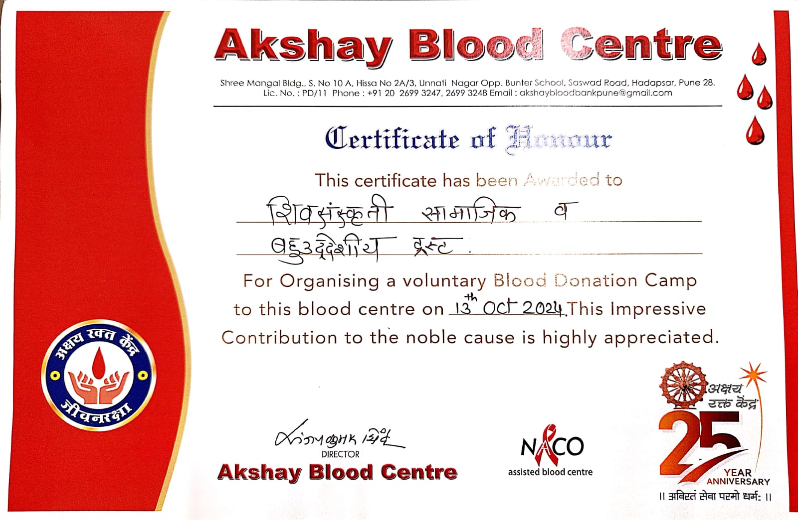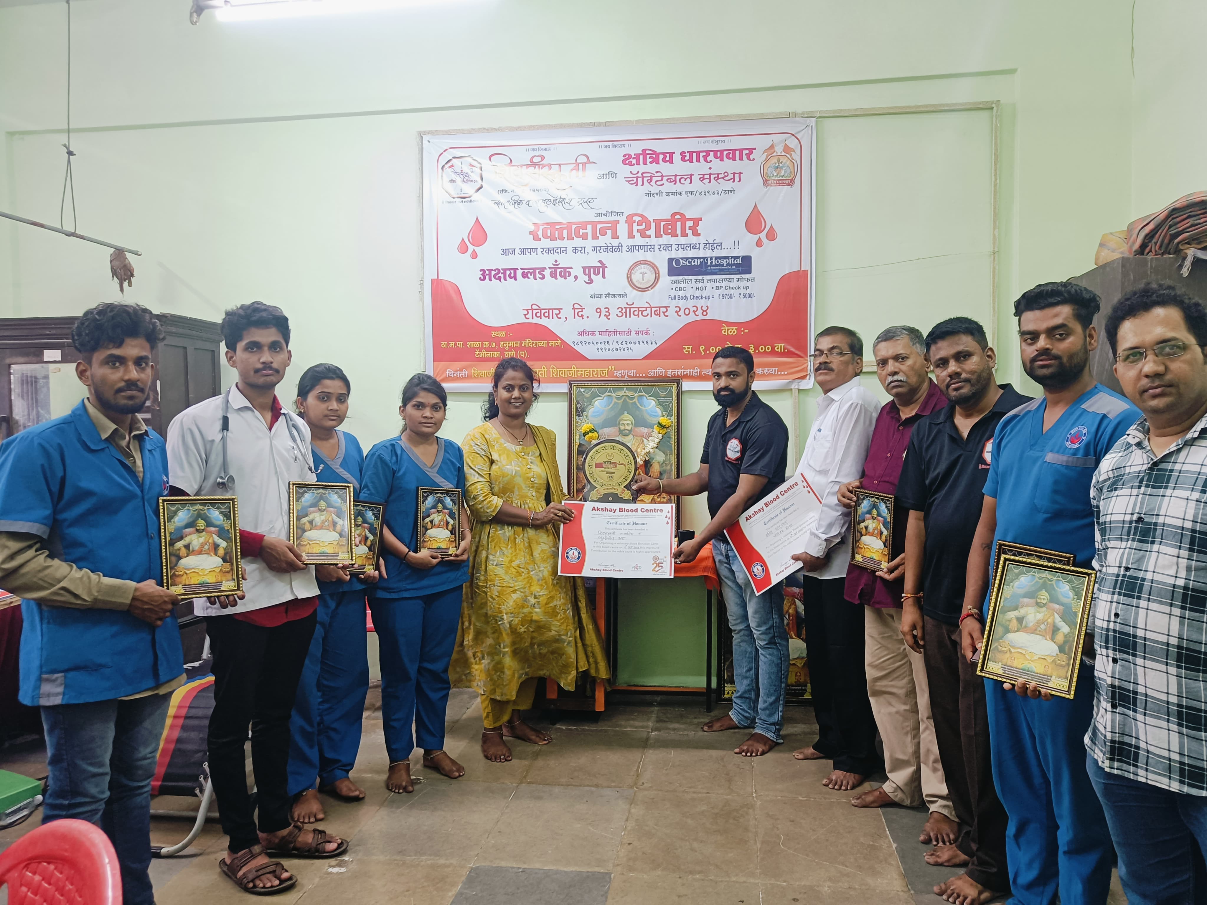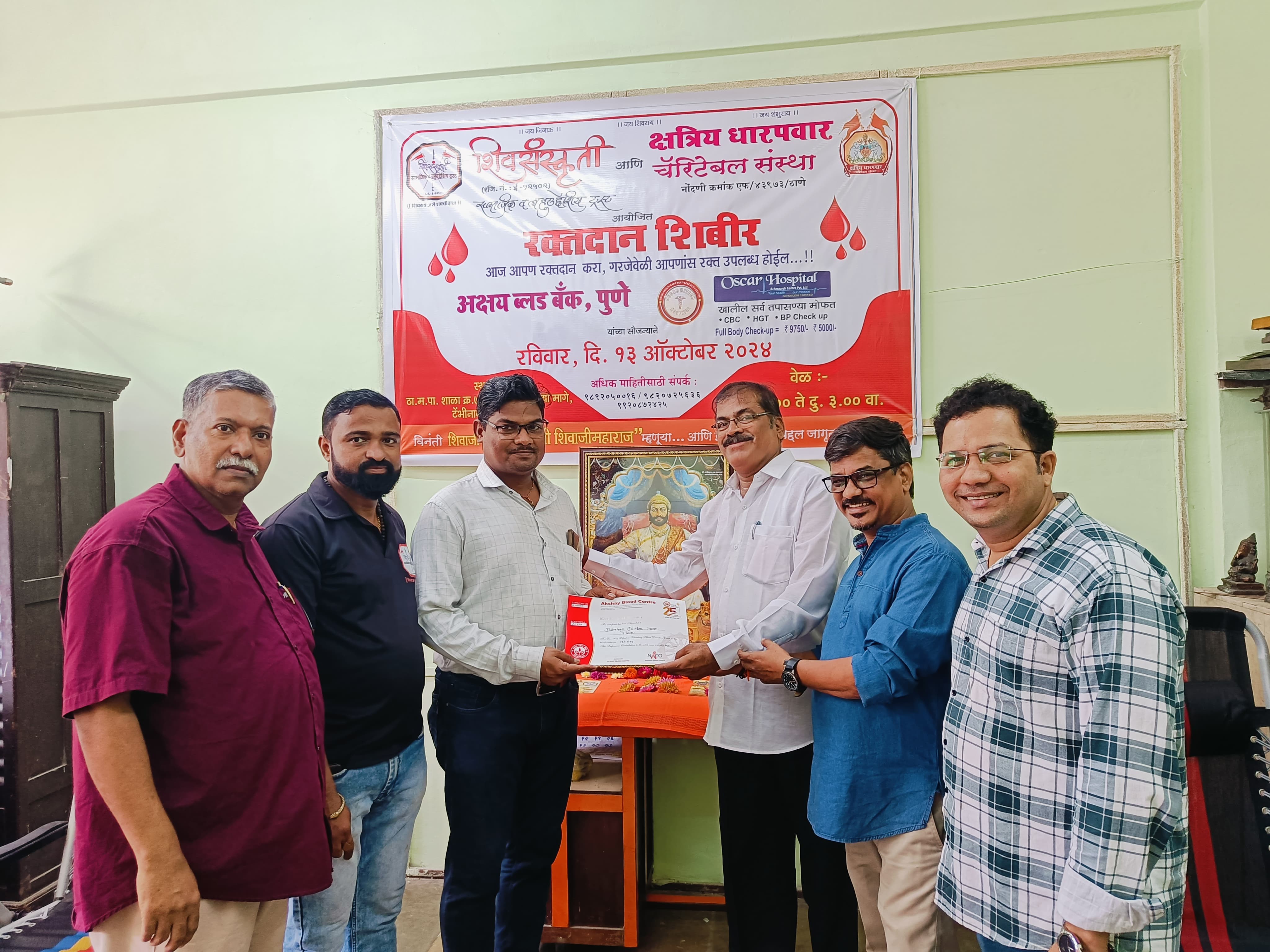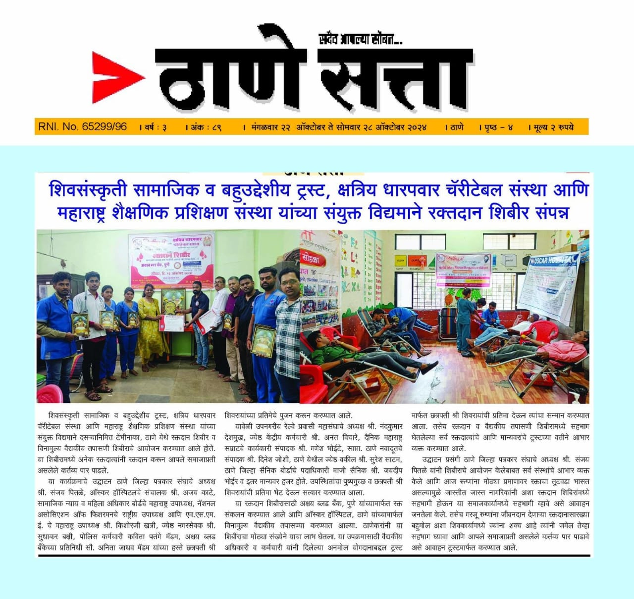 शिवसंस्कृती सामाजिक व बहुउद्देशीय ट्रस्ट, क्षत्रिय धारपवार चॅरीटेबल संस्था आणि महाराष्ट्र शैक्षणिक प्रशिक्षण संस्था यांच्या संयुक्त विद्यमाने दसऱ्यानिमित्त ठा.म.पा शाळा क्र. ७, टेंभीनाका, ठाणे येथे रक्तदान शिबीराचे आयोजन करण्यात आले होते. या रक्तदान शिबीरामध्ये अनेक रक्तदात्यांनी रक्तदान करून आपले समाजाप्रती असलेले कर्तव्य पार पाडले. या कार्यक्रमाचे उदघाटन ठाणे जिल्हा पत्रकार संघाचे अध्यक्ष श्री. संजय पितळे, ऑस्कर हॉस्पिटलचे डायरेक्टर श्री. अजय काटे, सामाजिक न्याय व महिला अधिकार बोर्डचे महाराष्ट्र उपाध्यक्ष, नॅशनल असोसिएशन ऑफ फिशरमनचे राष्ट्रीय उपाध्यक्ष आणि एम.एस.एम.ईचे महाराष्ट्र उपाध्यक्ष श्री. किशोरजी खत्री, ज्येष्ठ नगरसेवक श्री. सुधाकर बक्षी, पोलिस कर्मचारी कविता पतंगे मॅडम, अक्षय ब्लड बँकेच्या प्रतिनिधी सौ. अनिता जाधव यांच्या हस्ते करून छत्रपती श्री शिवरायांच्या प्रतिमेचे पुजन करण्यात आले. यावेळी उपनगरीय रेल्वे प्रवासी महासंघाचे अध्यक्ष श्री. नंदकुमार देशमुख, ज्येष्ठ केंद्रीय कर्मचारी श्री. अनंत विचारे, दैनिक महाराष्ट्र सम्राटचे संपादक श्री. गणेश भोईटे, साप्ता. ठाणे नवादूतचे संपादक श्री. दिनेश जोशी, ठाणे येथील ज्येष्ठ वकील श्री. सुरेश साटम, जिल्हा सैनिक बोर्डाचे माजी सैनिक श्री. जयदीप भोईर व इतर मान्यवर हजर होते. उपस्थितांचा पुष्पगुच्छ व छत्रपती श्री शिवरायांची प्रतिमा भेट देऊन सत्कार करण्यात आला. या रक्तदान शिबीरासाठी अक्षय ब्लड बँक, पुणे यांचेमार्फत रक्त संकलन करण्यात आले. तसेच ऑस्कर हॉस्पिटल, ठाणे यांच्यामार्फत विनामुल्य वैद्यकीय तपासण्या करण्यात आल्या. ठाणेकरांनी मोठ्या संख्येने याचा लाभ घेतला. या उपक्रमासाठी वैद्यकीय अधिकारी व इतर कर्मचारी यांनी दिलेल्या अनमोल योगदानाबद्दल ट्रस्ट मार्फत छत्रपती श्री शिवरायांची प्रतिमा देऊन त्यांचा सन्मान करण्यात आला. या रक्तदान शिबीरामध्ये सहभाग घेतलेल्या सर्व रक्तदात्यांचे आणि मान्यवरांचे ट्रस्टच्या वतीने आभार व्यक्त करण्यात आले. उद्घाटन प्रसंगी ठाणे जिल्हा पत्रकार संघाचे अध्यक्ष श्री. संजय पितळे यांनी शिबीराचे आयोजन केलेबाबत सर्व संस्थांचे आभार व्यक्त केले आणि आज रूग्णांना मोठ्या प्रमाणावर रक्ताचा तुटवडा भासत असल्यामुळे जास्तीत जास्त नागरिकांनी अशा रक्तदान शिबिरांमध्ये सहभागी होऊन या समाजकार्यामध्ये सहभागी व्हावे असे आवाहन जनतेला केले. तसेच गरजू रुग्णांना जीवनदान देणाऱ्या रक्तदानासारख्या बहुमोल अशा शिवकार्यामध्ये ज्यांना शक्य आहे त्यांनी जमेल तेव्हा सहभाग घ्यावा आणि आपले समाजाप्रती असलेले कर्तव्य पार पाडावे असे आवाहन ट्रस्टमार्फत करण्यात आले.