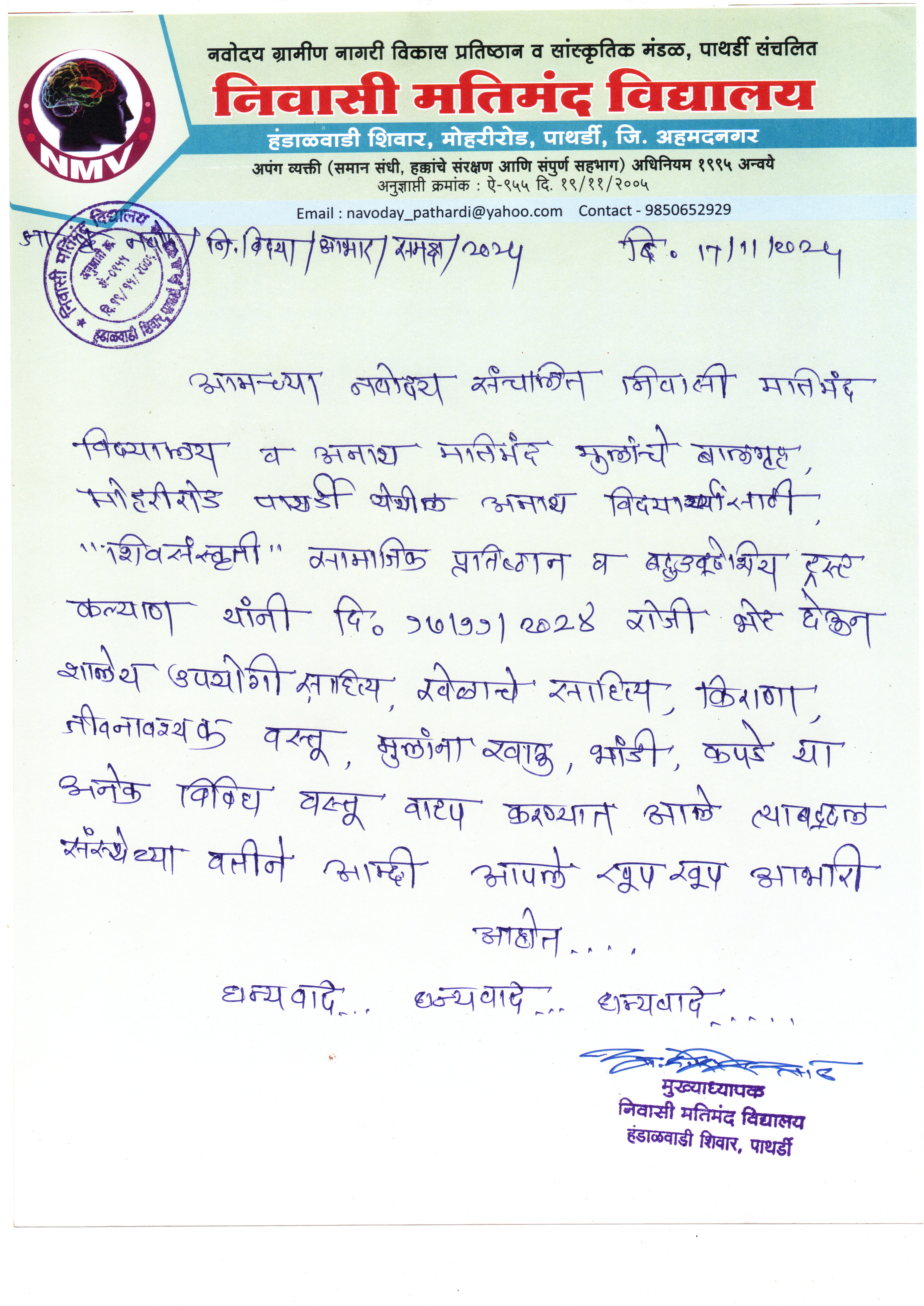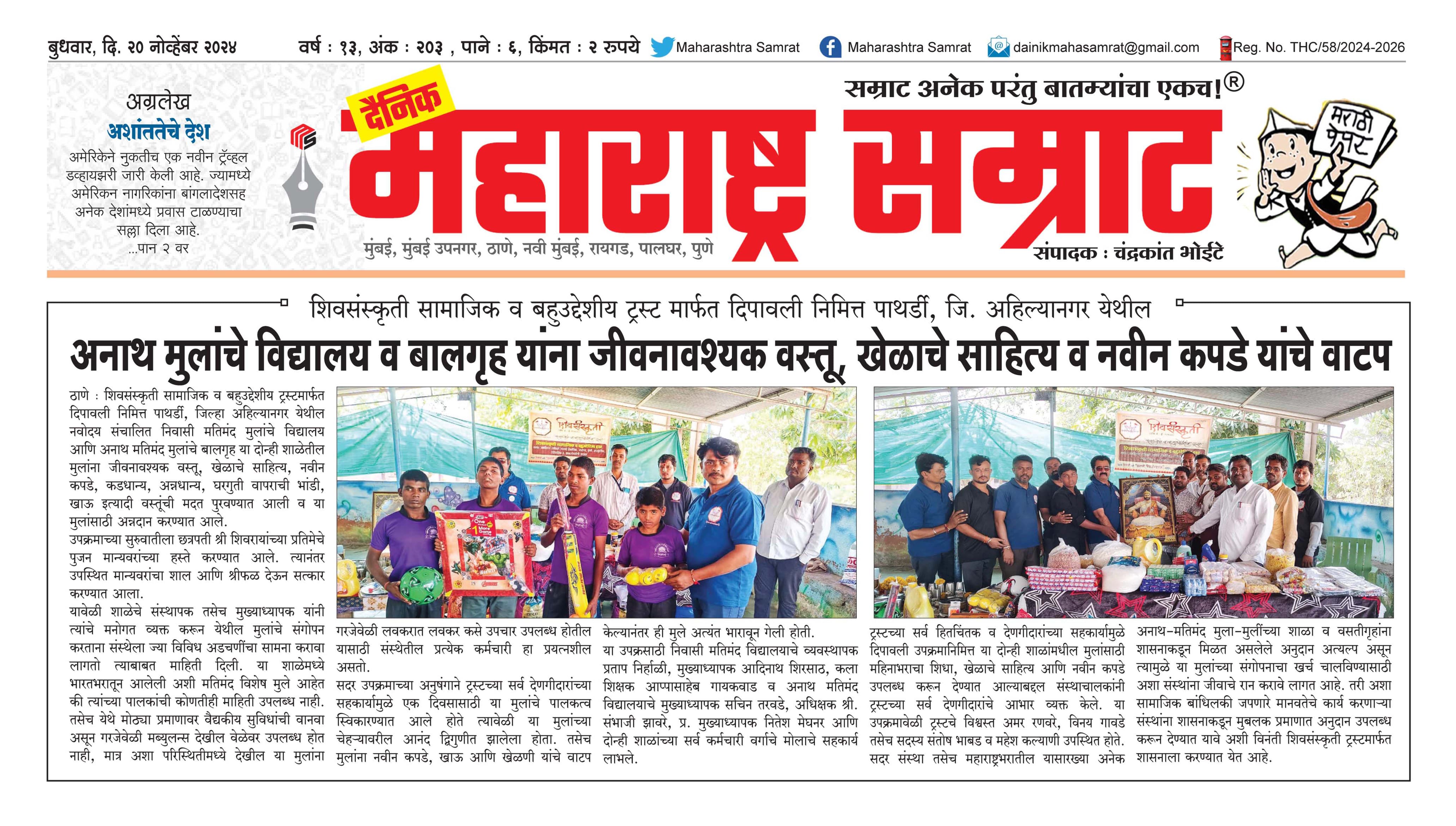 शिवसंस्कृती सामाजिक व बहुउद्देशीय ट्रस्टमार्फत दिपावली निमित्त पाथर्डी, जिल्हा अहिल्यानगर येथील नवोदय संचालित निवासी मतिमंद मुलांचे विद्यालय आणि अनाथ मतिमंद मुलांचे बालगृह या दोन्ही शाळेतील मुलांना जीवनावश्यक वस्तू, खेळाचे साहित्य, नवीन कपडे, कडधान्य, अन्नधान्य, घरगुती वापराची भांडी, खाऊ इत्यादी वस्तूंची मदत पुरवण्यात आली व या मुलांसाठी अन्नदान करण्यात आले. उपक्रमाच्या सुरुवातीला छत्रपती श्री शिवरायांच्या प्रतिमेचे पुजन मान्यवरांच्या हस्ते करण्यात आले. त्यानंतर उपस्थित मान्यवरांचा शाल आणि श्रीफळ देऊन सत्कार करण्यात आला. यावेळी शाळेचे संस्थापक तसेच मुख्याध्यापक यांनी त्यांचे मनोगत व्यक्त करून येथील मुलांचे संगोपन करताना संस्थेला ज्या विविध अडचणींचा सामना करावा लागतो त्याबाबत माहिती दिली. या शाळेमध्ये भारतभरातून आलेली अशी मतिमंद विशेष मुले आहेत की त्यांच्या पालकांची कोणतीही माहिती उपलब्ध नाही. तसेच येथे मोठ्या प्रमाणावर वैद्यकीय सुविधांची वानवा असून गरजेवेळी ॲमब्युलन्स देखील वेळेवर उपलब्ध होत नाही, मात्र अशा परिस्थितीमध्ये देखील या मुलांना गरजेवेळी लवकरात लवकर कसे उपचार उपलब्ध होतील यासाठी संस्थेतील प्रत्येक कर्मचारी हा प्रयत्नशील असतो. सदर उपक्रमाच्या अनुषंगाने ट्रस्टच्या सर्व देणगीदारांच्या सहकार्यामुळे एक दिवसासाठी या मुलांचे पालकत्व स्विकारण्यात आले होते त्यावेळी या मुलांच्या चेहऱ्यावरील आनंद द्विगुणीत झालेला होता. तसेच मुलांना नवीन कपडे, खाऊ आणि खेळणी यांचे वाटप केल्यानंतर ही मुले अत्यंत भारावून गेली होती. या उपक्रसाठी निवासी मतिमंद विद्यालयाचे व्यवस्थापक श्री. प्रताप निर्हाळी, मुख्याध्यापक श्री. आदिनाथ शिरसाठ, कला शिक्षक श्री. आप्पासाहेब गायकवाड व अनाथ मतिमंद विद्यालयाचे मुख्याध्यापक श्री. सचिन तरवडे, अधिक्षक श्री. संभाजी झावरे, प्र. मुख्याध्यापक श्री. नितेश मेघनर आणि दोन्ही शाळांच्या सर्व कर्मचारी वर्गाचे मोलाचे सहकार्य लाभले. ट्रस्टच्या सर्व हितचिंतक व देणगीदारांच्या सहकार्यामुळे दिपावली उपक्रमानिमित्त या दोन्ही शाळांमधील मुलांसाठी महिनाभराचा शिधा, खेळाचे साहित्य आणि नवीन कपडे उपलब्ध करून देण्यात आल्याबद्दल संस्थाचालकांनी ट्रस्टच्या सर्व देणगीदारांचे आभार व्यक्त केले. या उपक्रमावेळी ट्रस्टचे विश्वस्त श्री. अमर रणवरे, श्री. विनय गावडे तसेच सदस्य श्री. संतोष भाबड व श्री. महेश कल्याणी उपस्थित होते. सदर संस्था तसेच महाराष्ट्रभरातील यासारख्या अनेक अनाथ-मतिमंद मुला-मुलींच्या शाळा व वसतीगृहांना शासनाकडून मिळत असलेले अनुदान अत्यल्प असून त्यामुळे या मुलांच्या संगोपनाचा खर्च चालविण्यासाठी अशा 