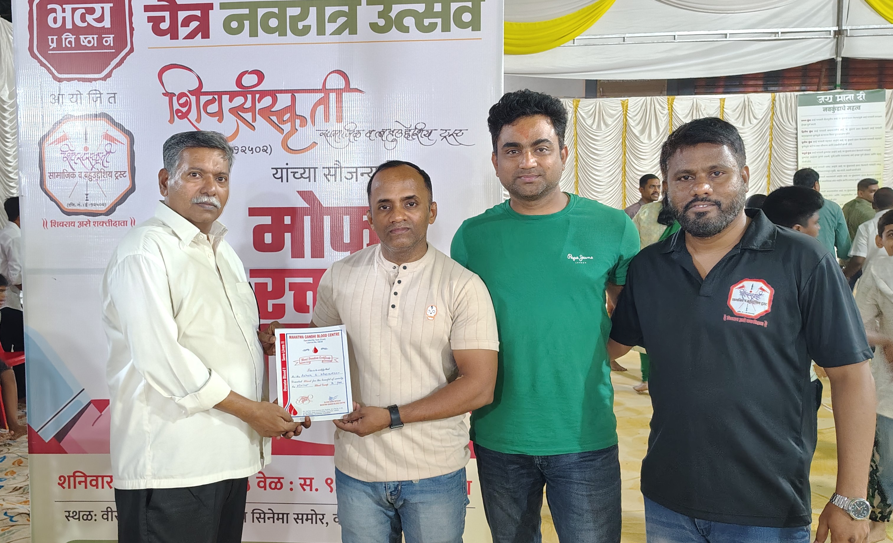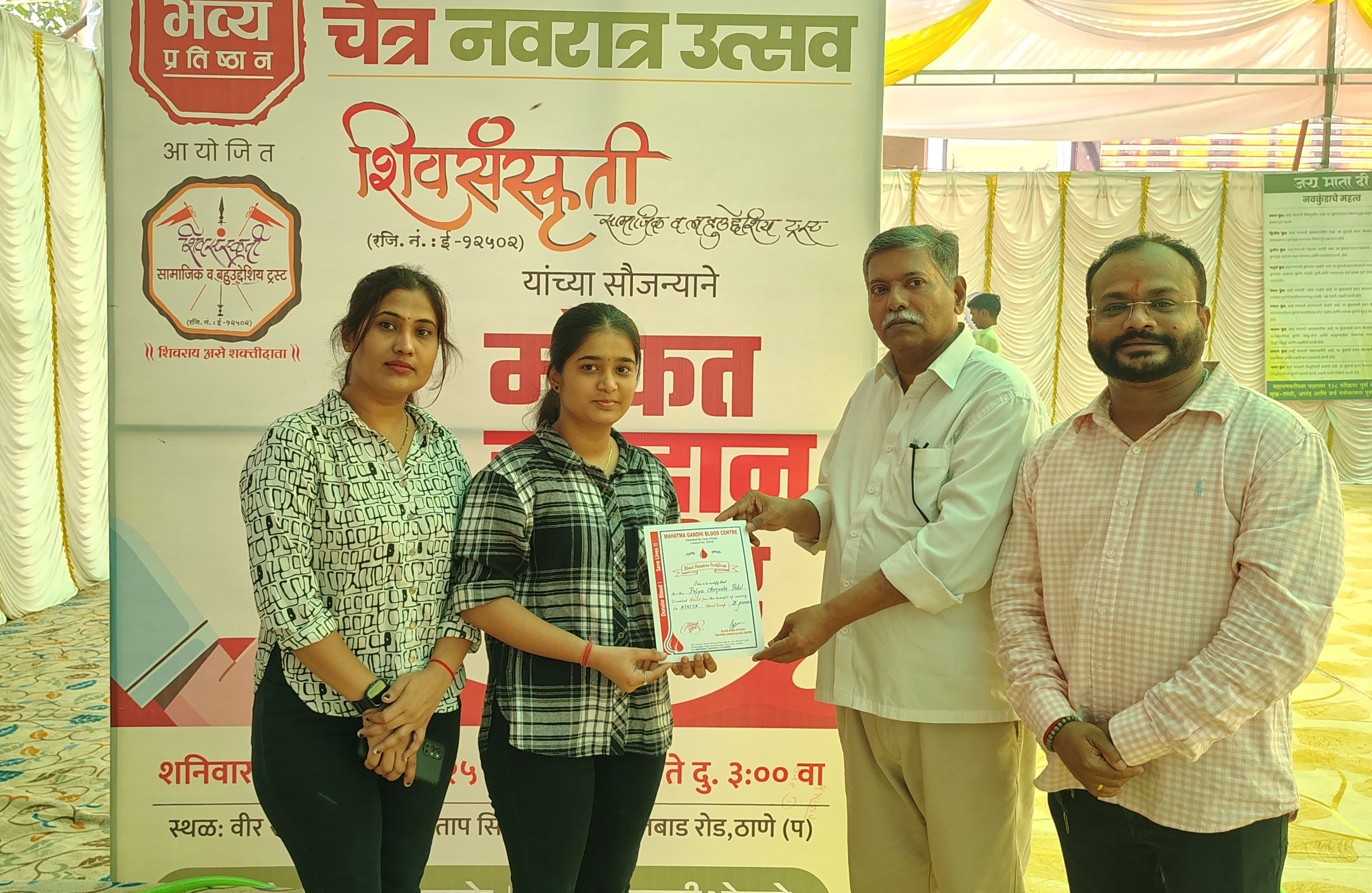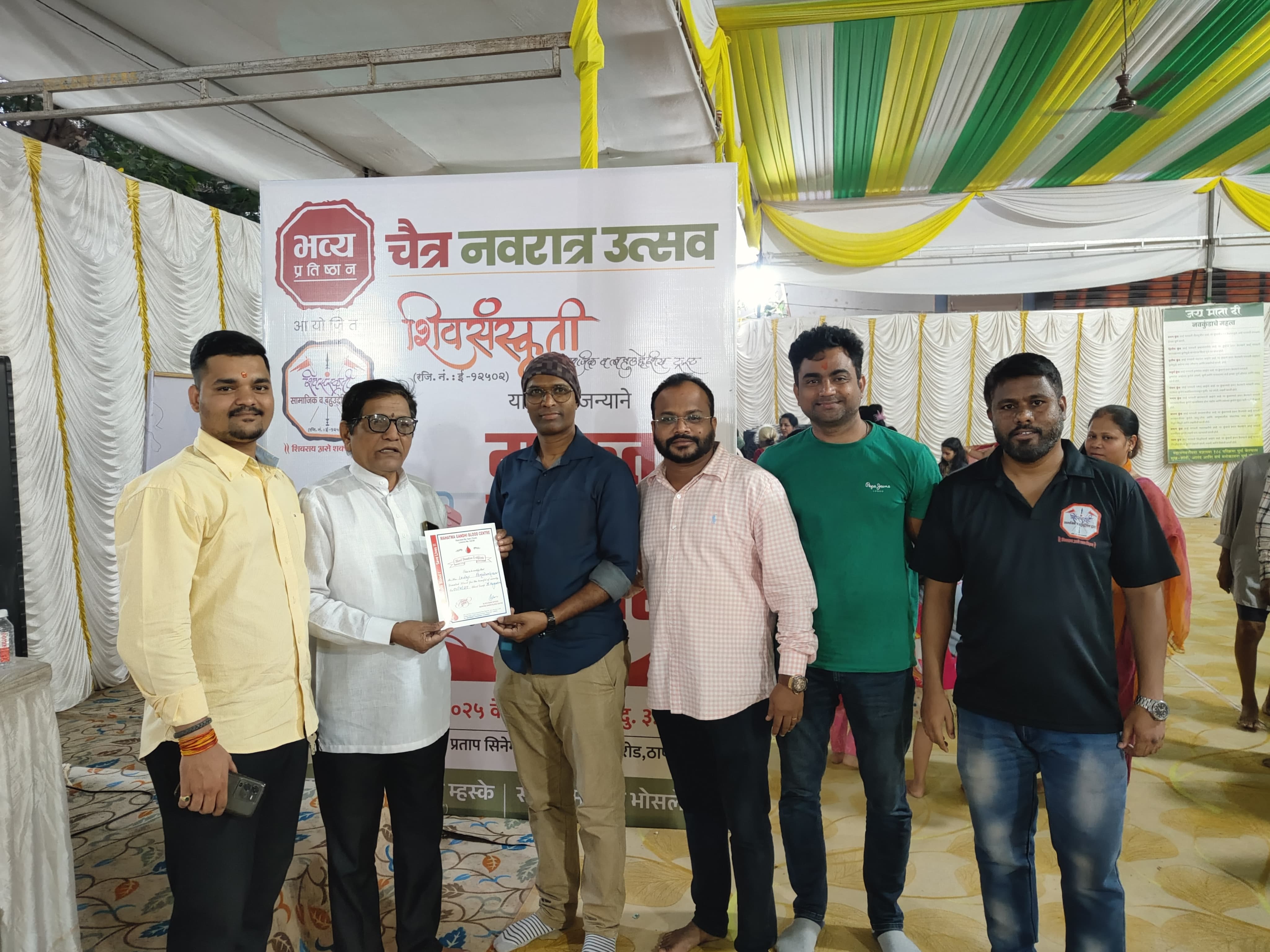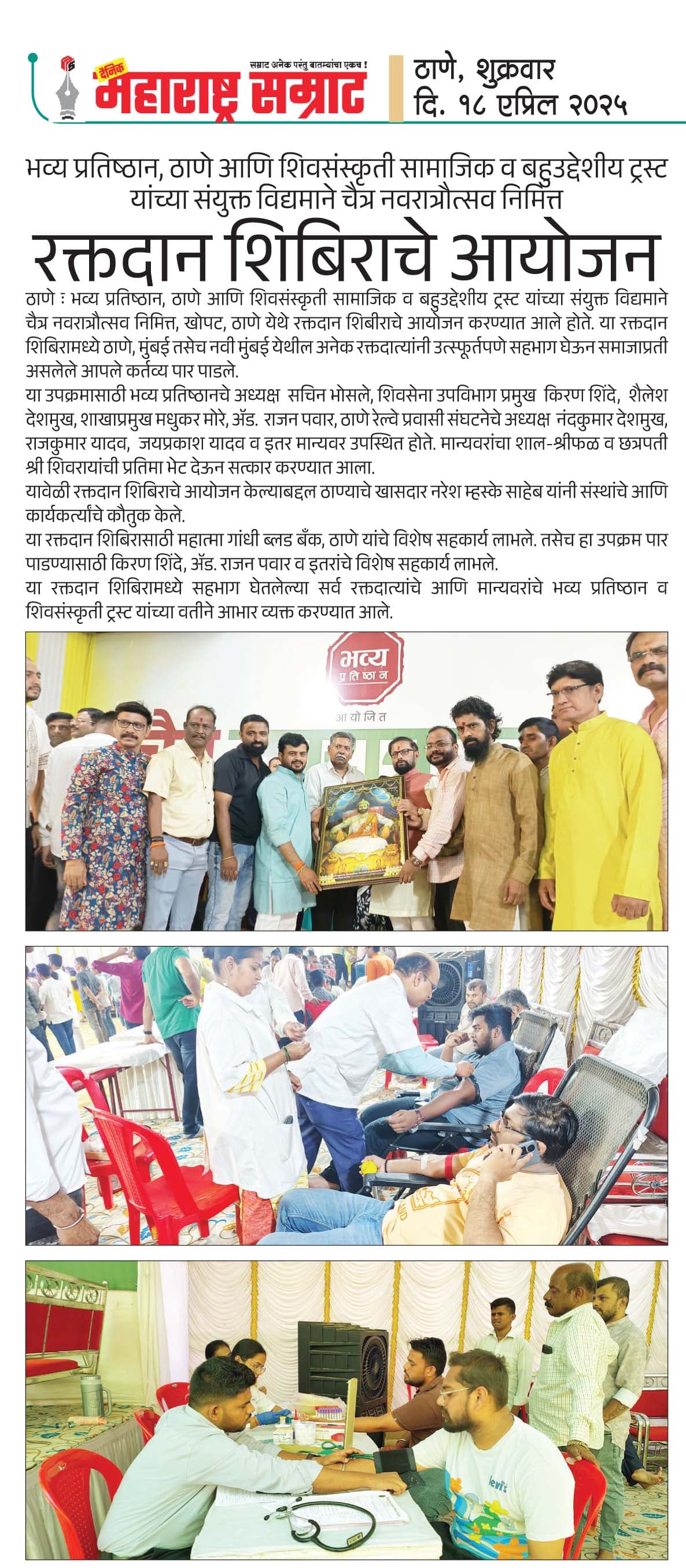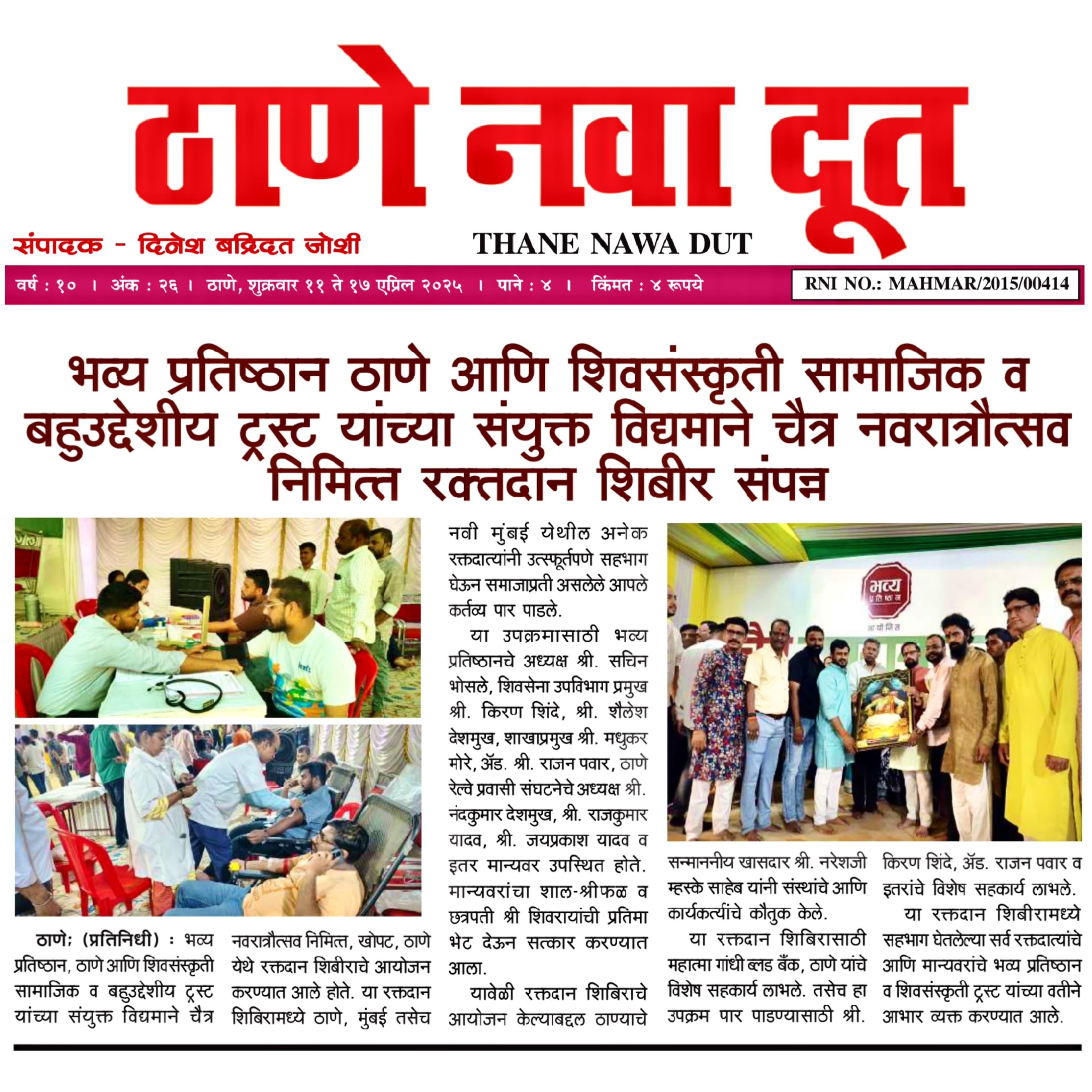 भव्य प्रतिष्ठान, ठाणे आणि शिवसंस्कृती सामाजिक व बहुउद्देशीय ट्रस्ट यांच्या संयुक्त विद्यमाने चैत्र नवरात्रौत्सव निमित्त, खोपट, ठाणे येथे रक्तदान शिबीराचे आयोजन करण्यात आले होते. या रक्तदान शिबिरामध्ये ठाणे, मुंबई तसेच नवी मुंबई येथील अनेक रक्तदात्यांनी उत्स्फूर्तपणे सहभाग घेऊन समाजाप्रती असलेले आपले कर्तव्य पार पाडले. या उपक्रमासाठी भव्य प्रतिष्ठानचे अध्यक्ष श्री. सचिन भोसले, शिवसेना उपविभाग प्रमुख श्री. किरण शिंदे, श्री. शैलेश देशमुख, शाखाप्रमुख श्री. मधुकर मोरे, ॲड. श्री. राजन पवार, ठाणे रेल्वे प्रवासी संघटनेचे अध्यक्ष श्री. नंदकुमार देशमुख, श्री. राजकुमार यादव, श्री. जयप्रकाश यादव व इतर मान्यवर उपस्थित होते. मान्यवरांचा शाल-श्रीफळ व छत्रपती श्री शिवरायांची प्रतिमा भेट देऊन सत्कार करण्यात आला. यावेळी रक्तदान शिबिराचे आयोजन केल्याबद्दल ठाण्याचे सन्माननीय खासदार श्री. नरेशजी म्हस्के साहेब यांनी संस्थांचे आणि कार्यकर्त्यांचे कौतुक केले. या रक्तदान शिबिरासाठी महात्मा गांधी ब्लड बँक, ठाणे यांचे विशेष सहकार्य लाभले. तसेच हा उपक्रम पार पाडण्यासाठी श्री. किरण शिंदे, ॲड. राजन पवार व इतरांचे विशेष सहकार्य लाभले. या रक्तदान शिबीरामध्ये सहभाग घेतलेल्या सर्व रक्तदात्यांचे आणि मान्यवरांचे भव्य प्रतिष्ठान व शिवसंस्कृती ट्रस्ट यांच्या वतीने आभार व्यक्त करण्यात आले.