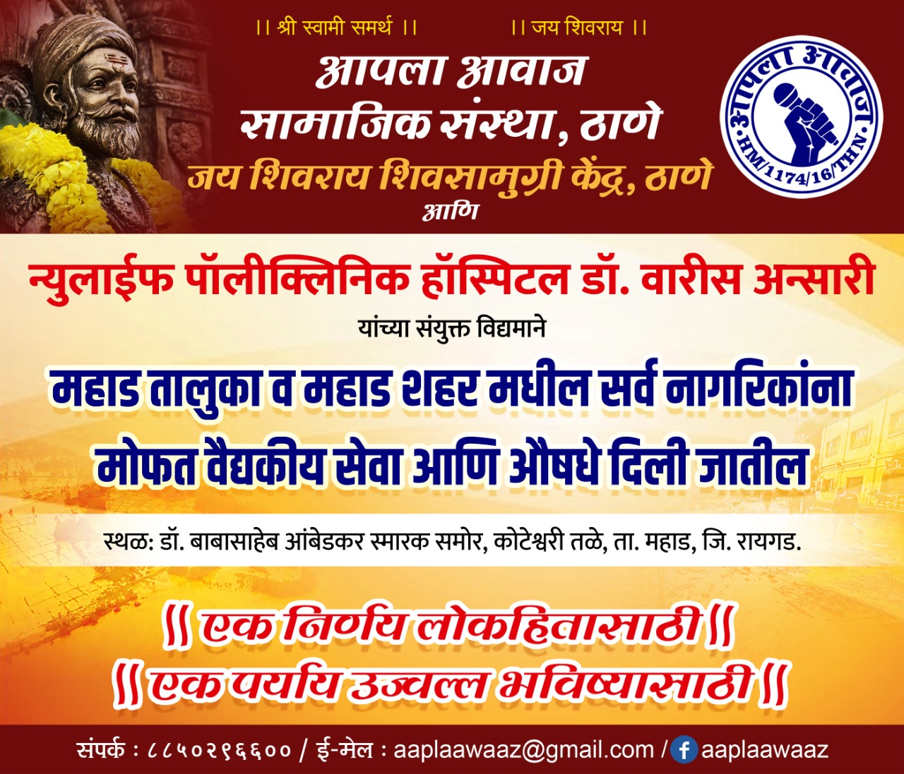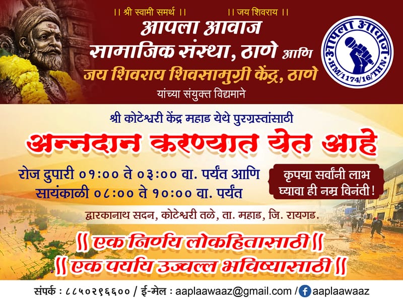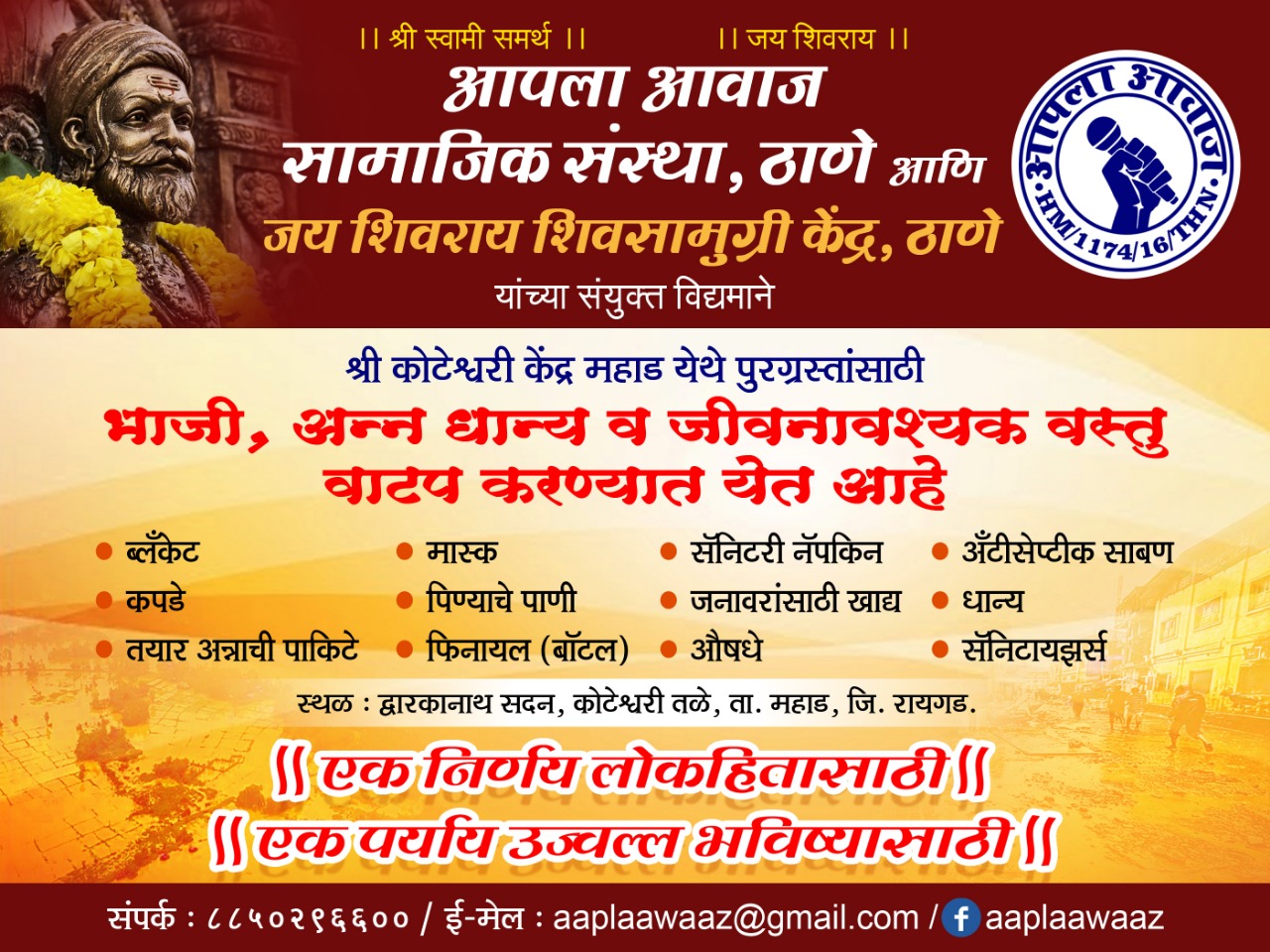 आपला आवाज सामाजिक संस्था, ठाणे या संस्थेच्या सहकार्याने सन २०२१ साली महाराष्ट्रात उद्भवलेल्या पुरपरिस्थितीमध्ये ता. महाड, जिल्हा रायगड येथील नवीन वसाहत, कोंडीवते, कोटेश्वरी तळे, नवेनगर, शिरगाव, काजळपुरा, घरटकर आळी, काकरतळे, महाड बाजारपेठ, गवाळ आळी या महाड तालुक्यामधील विविध पुरग्रस्त गावांमध्ये जवळ जवळ दोन महीने भाजीपाला, चटई, चादर, टॉवेल, साड्या, कपडे, अन्नधान्य व इतर जीवनावश्यक वस्तूंचा पुरवठा करण्यात आला. तसेच न्यु लाईफ पॉलीक्लीनिक हॉस्पिटलचे डॉ. वारीस अन्सारी यांच्या माध्यमातून महाड तालुका व शहरामधील पुराने बाधित झालेल्या विविध आजारग्रस्त रुग्णांसाठी मोफत वैद्यकीय सेवा राबवून औषधांचे वाटप करण्यात आले. या उपक्रमामध्ये छत्रपती संभाजीराजे भाजीपाला व्यापारी मंडळ, ए.पी.एम.सी. मार्केट, नवी मुंबई आणि जांभळी नाका, ठाणे येथील भाजीपाला व्यापारी यांच्या मार्फत वेळोवेळी मोठ्या प्रमाणावर ताजा व स्वच्छ भाजीपाला उपलब्ध करून देण्यात आला. पुरपरिस्थिती निवळल्यानंतर आलेल्या दीपावली सणामध्ये या ग्रामस्थांना दिवाळीचा फराळ व एल.ई.डी बल्बचे मोठ्या प्रमाणावर वाटप करण्यात आले तसेच पुरग्रस्तांसाठी राबविण्यात आलेल्या मद्त उपक्रमामध्ये आर्थिक व वस्तुरूपी मद्त केलेल्या सर्व हितचिंतकांचे सन्मानपत्र देऊन आभार मानण्यात आले